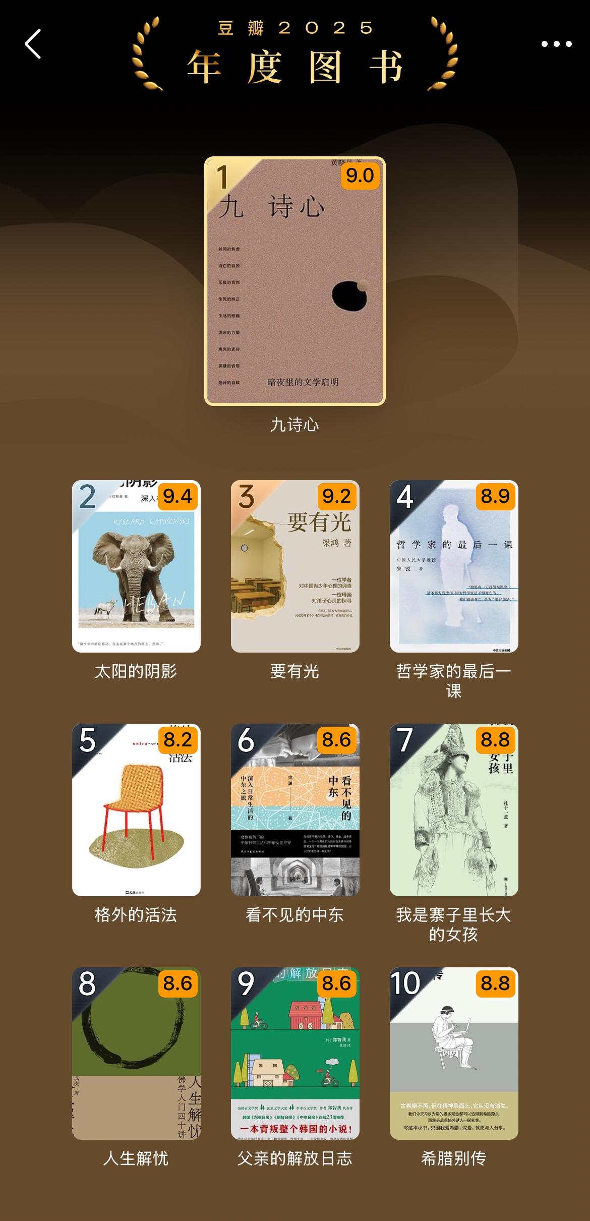 2025年,豆瓣年度读书榜单前十名: 1、《九诗心》:作者黄晓丹,豆瓣评分9.2分。 2、《要有光》:作者梁鸿,豆瓣评分9.3分 3、《哲学家的最后一课》:作者朱锐,豆瓣评分8.9分。 4、《太阳的阴影》:作者是波兰的雷沙德・卡普希钦斯基,豆瓣评分9.0分。 5、《格外的活法》:作者是日本的吉井忍,豆瓣评分8.2分。 6、《看不见的中东》:作者姚璐,豆瓣评分8.7分。 7、《人生解忧》:作者成庆,豆瓣评分8.7分。 8、《父亲的解放日志》:作者是韩国的郑智我,豆瓣评分8.6分。 9、《希腊别传》:作者陈嘉映,豆瓣评分8.8分。 10、《如何快速了解一个行业》:作者肖璟,豆瓣评分9.0分。 读书和不读书,人生差的可不止是钱。上层社会总有些书不愿穷人看到,怕我们看透规则的双面性。 比如《贫穷的本质》,戳破“穷人懒惰”的谎言;《黑天鹅》揭露精英编织的确定性幻觉;《富爸爸穷爸爸》撕碎“读书致富”的迷思;《国富论》解码市场背后的血腥逻辑;《潜规则》则直指社会运行的隐形法则。 这些书像五把钥匙,打开被遮蔽的认知之门。穷人看到的规则讲公平、努力,而真正的规则关乎杠杆、稀缺和人性。不看透这些,再努力也可能白费。读书,让我们更稳,更懂世界。