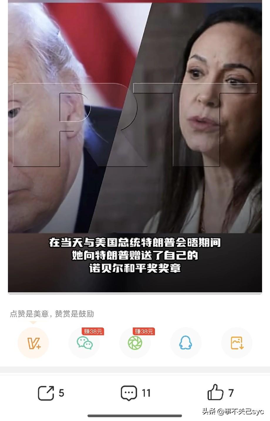 当地时间1月15日,委内瑞拉反对派领导人马查多表示,在当天与美国总统特朗普会晤期间,她向特朗普赠送了自己的诺贝尔和平奖奖章。当被问及特朗普是否接受该奖章时,她未予回应。——路透社对此进行了报道。 委内瑞拉反对派领导人玛丽亚·科里娜·马查多在获得2025年诺贝尔和平奖后,公开表示愿将奖项“献给”或“转赠”特朗普,以感谢他对委内瑞拉民主运动的支持。她称特朗普“值得这一荣誉”,并计划在会面时亲自表达这一意愿。特朗普对此回应称“这是莫大的荣幸”,并期待与马查多会面。 然而,诺贝尔奖官方明确声明:奖项一经授予,不得撤销、共享或转赠,该决定为最终且永久有效。因此,尽管马查多表达了转赠意愿,但此举不符合诺贝尔委员会规则,不具备实际效力。 美国抓捕马杜罗后,2026年1月3日,特朗普在记者会上直言马查多在委内瑞拉国内“缺乏支持”且“得不到民众尊重”,不具备担任领导人的威信。 马查多这次在白宫会见特朗普是不是来送奖章? 有网友说送晚了,比较赞成这个观点,确实晚了。马查多要讨好特朗普,也知道特朗普很想得到这枚奖章,为什么不在诺奖公布前把特朗普推荐诺奖评委会,表达自己愿意将今年和平奖让给特朗普呢?等到公布了你再转赠,这不是打脸吗?尽管特朗普可能理解马查多的好意,但这样的转赠还是让特朗普很没面子。 现在好了,马查多的一番操作,被舆论贴上政治投机的标签。 好事都办不好,德才都不配位,还有什么野心!