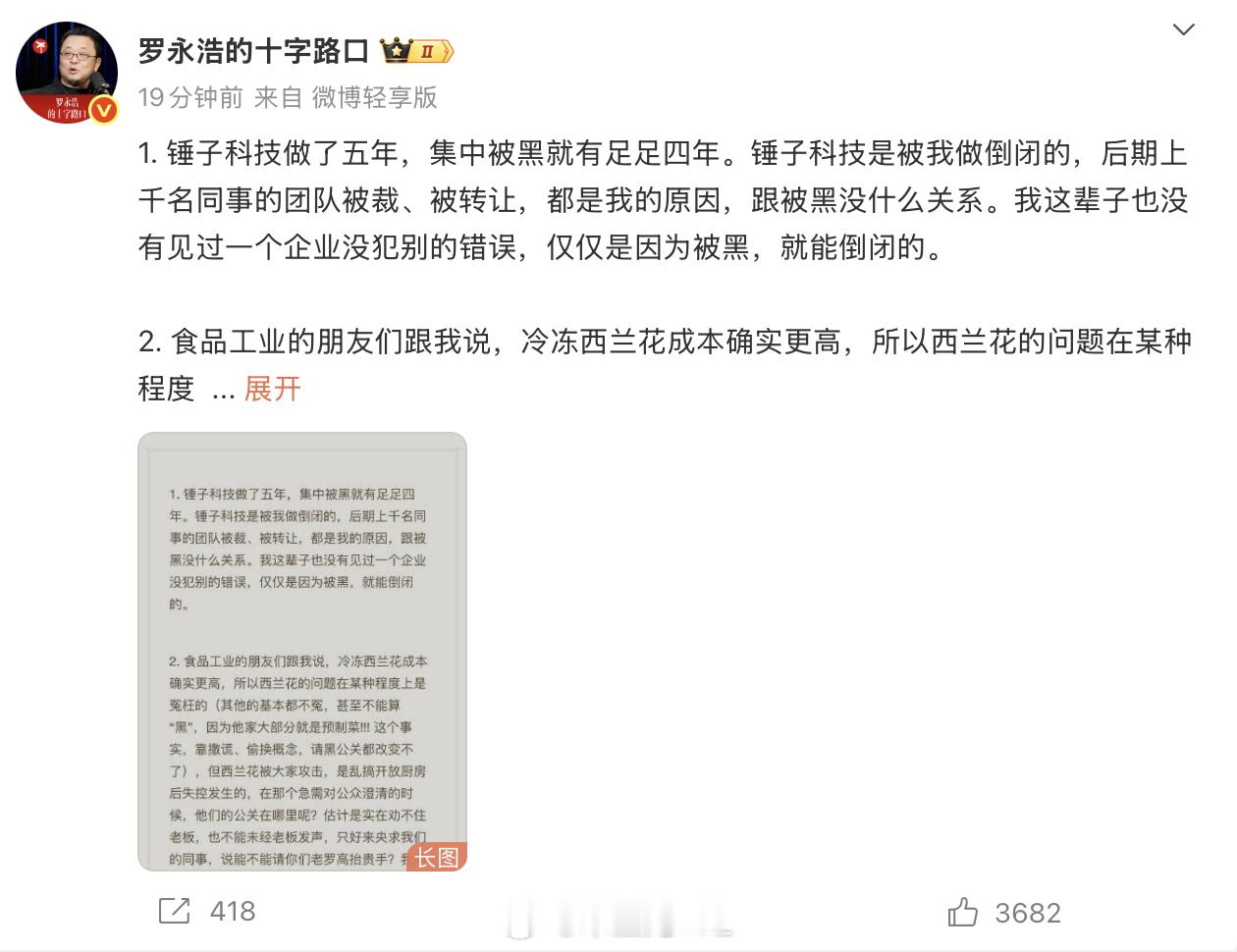 罗永浩称没见过企业因为被黑就倒闭,罗永浩回应贾国龙朋友圈 老罗现在继续说这个事情,我估计后续路走得比较窄“一个企业没犯别的错误,仅仅是因为被黑,就能倒闭的”在经济周期好的时候是的,但是现在这个周期确实是有点变了,企业错误有的,舆论放大了问题,立见生死,而上面监管只看到企业瓜球了,员工失业了,是这种噪音导致现在的局面这个事情,你从不同角度都可以解读,但是上面认为你一张嘴消灭一个企业,老罗需要懂得克制一下😂,经济周期不一样了