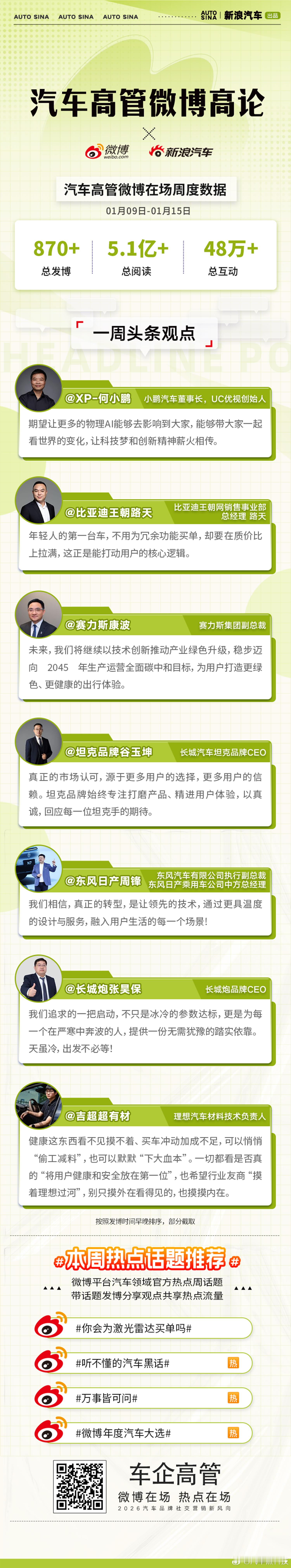 以用户为中心,科技驱动创新,共筑绿色、健康、可靠且富有温度的出行未来。汽车高管微博高论,省流速览微博一周高管精彩观点!