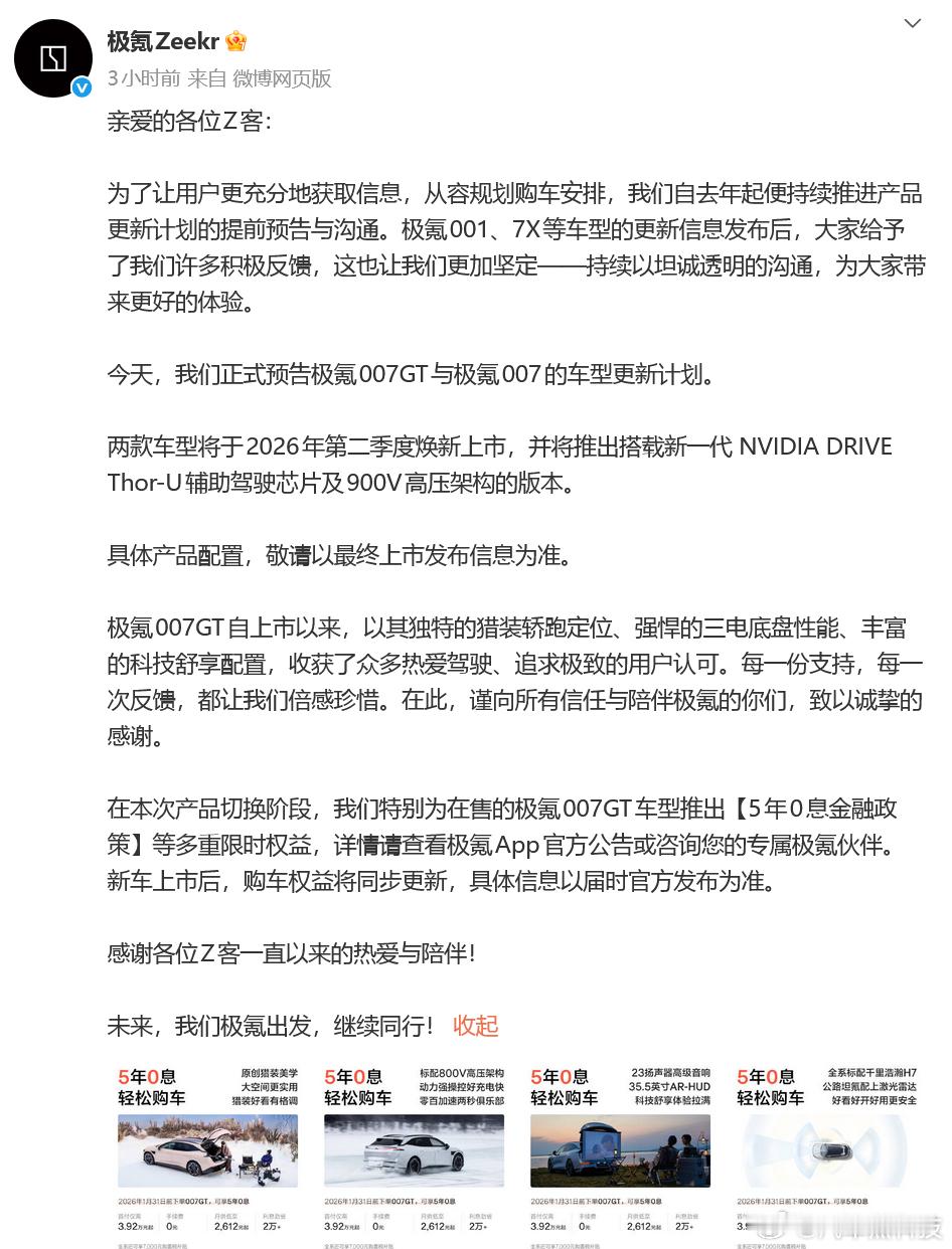 新款极氪007家族将于第二季度上市 刚刚 官宣,新款极氪007GT与极氪007,将于2026年第二季度焕新上市,并将推出搭载新一代 NVIDIA DRIVE Thor-U辅助驾驶芯片及900V高压架构的版本。