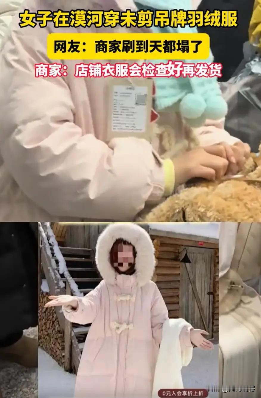 女子穿着带吊牌的羽绒服,这是打算穿完之后再退货的,据说这款羽绒服还火了。像这样的羽绒服退回来之后,再卖给其他消费者,如果第一个穿这衣服的这个女子有啥传染病的话,接盘的这个消费者可就倒霉了,现在看来,这东西的问题不小,真是有些防不胜防!