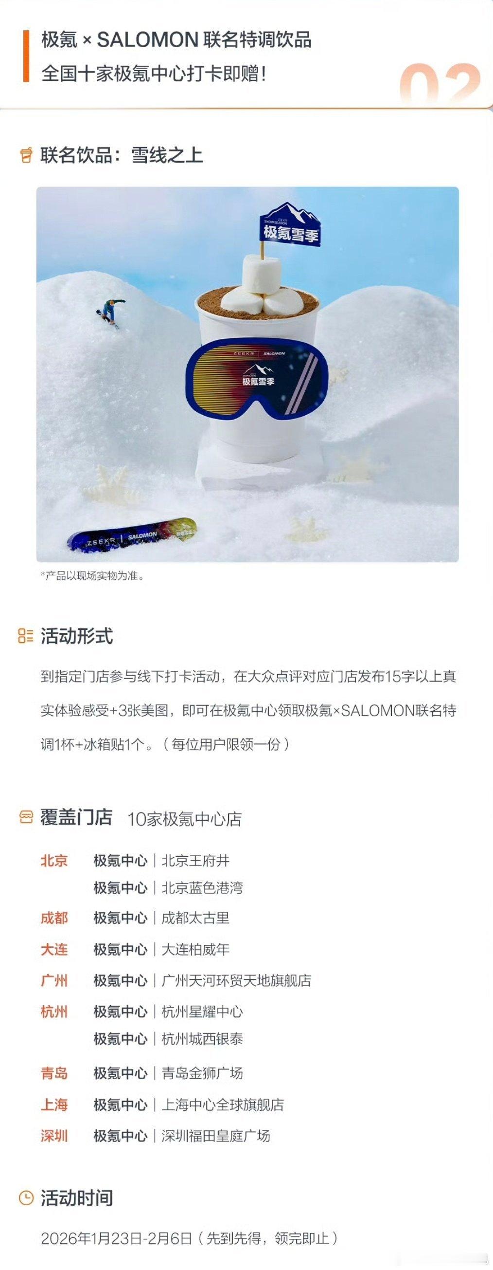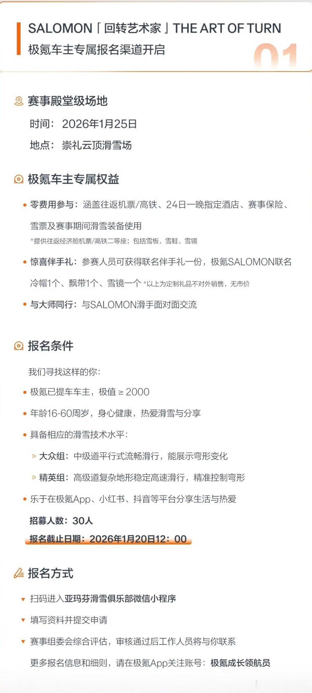 极氪8x 和salomon萨洛蒙 联名活动来了。一个是报名参加在崇礼的滑雪活动,两个条件,2000极值和一定的滑雪技术,对不起,我不会滑雪我哭了另一个是车主都能参加,打卡就能领取联名饮品和冰箱贴,东莞没有门店支持我又哭了大v聊车极氪