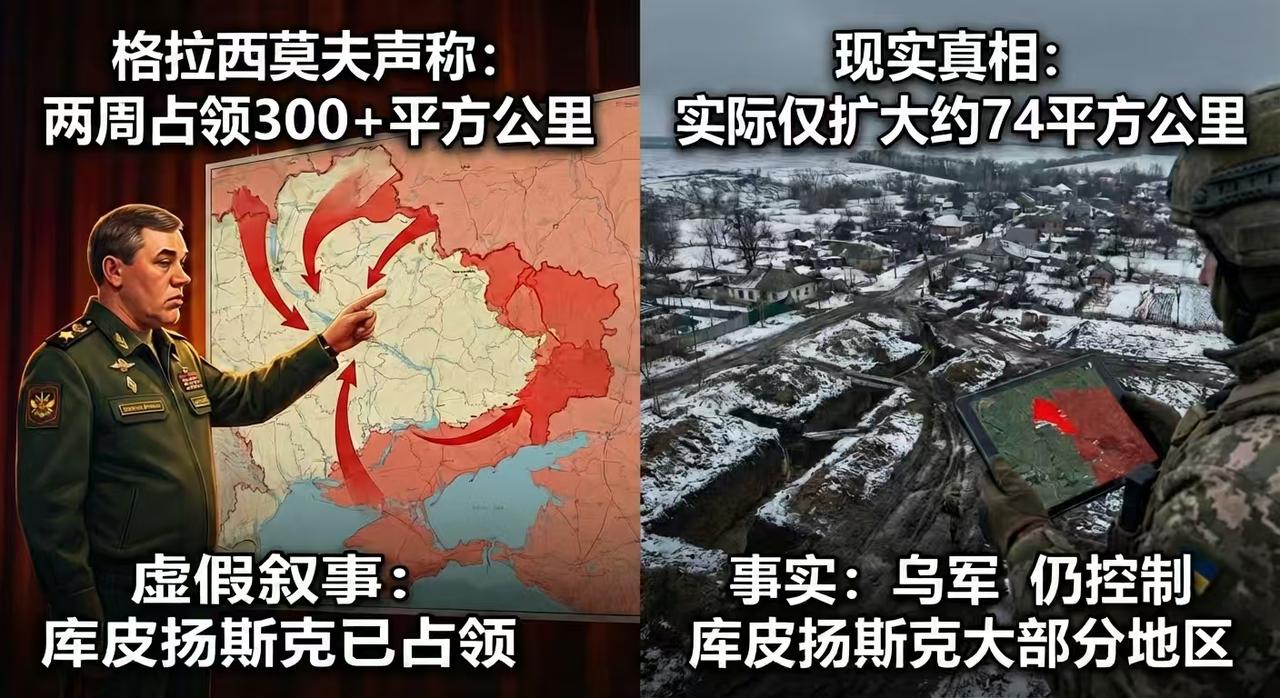 俄军总参谋长格拉西莫夫持续散布关于俄军战场战果的谎言和夸大之词,以推进克里姆林宫关于俄军必胜的虚假叙事。格拉西莫夫于1月15日声称,俄军几乎在所有方向都取得了进展,乌克兰阻止俄军推进的企图均告失败。格拉西莫夫还声称,俄军在2026年1月的前两周占领了超过300平方公里的领土。但ISW观察到的证据表明,俄军在12月31日至1月13日期间,通过渗透或进攻等方式仅仅扩大了73.82平方公里的军事存在——这大约只有格拉西莫夫声称战果的四分之一。 格拉西莫夫吹嘘称,俄军占领了乌克兰北部两个偏远的乡村,以此作为俄军在战场上取得重大胜利的证据。格拉西莫夫表示,俄军正在扩大苏梅州和哈尔科夫州的缓冲区,并特别强调了最近占领的赫拉博夫斯克(位于苏梅市西南部)以及声称占领的科马里夫卡(位于苏梅市西北部)。这些地区的战线多年来基本处于停滞状态,而俄军在2025年12月下旬和2026年1月中旬对这些小村庄发动的有限跨境袭击,很可能是为了制造信息效应。然而ISW持续评估认为,没有任何迹象表明俄军正在这些地区发动大规模地面攻势。