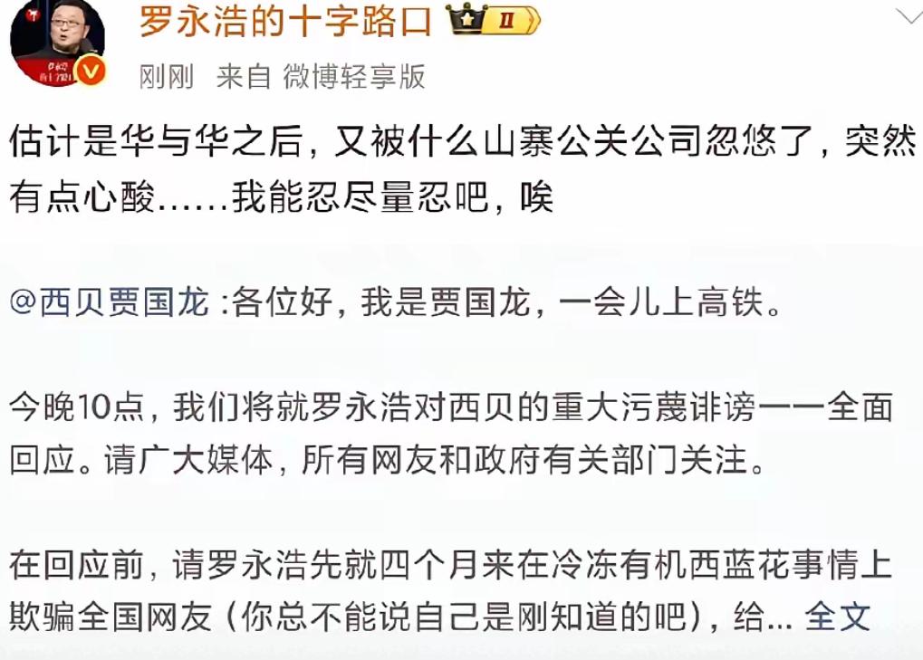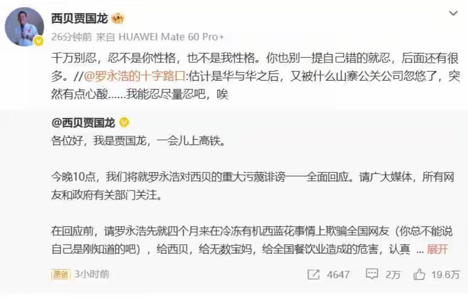 西贝的贾总劝上罗永浩了! 1月15日上午,贾总发文回应网传西贝一次关闭102家门店,属实。 当天晚上再发文,感谢“华与华”公司十年来的合作,同时感谢了老板华总。 今天1月16日,白天放话,今晚十点要让罗永浩道歉,尤其是“西兰花”这事上。 罗永浩回应:估计贾总又被山寨公关忽悠了,我尽量忍… 贾总不装了,摊牌了,直接回应:“千万别忍,忍不是你性格,也不是我性格。你也别一提自己错的就忍,后面还有很多。” 自此,贾总和罗永浩正式公开在网络上开撕,所谓光脚不怕穿鞋的,贾总的店都关了这么多,损失这么大,不折腾一下,还真让人看怂了。 不过,贾总到现在还没弄明白,不是预制菜的问题,而是预制菜不透明的问题,你可以用,顾客也要有选择权。 贾总这么如此张扬,是打算一条道走到黑,他始终认为,罗永浩的“污蔑”造就了西贝的今天。 作为商人老板,商业世界讲的是利益,而贾总还在讲兄弟情义,用十几年前的经验来经营现在的产业,不知道该夸还是该愁。 说不用公关,此地无银三百两,发文用几千员工失业这个点,有道德绑架引导舆论导向之嫌。 劝贾总还是不要冲动,沉默就是最好的公关,赢了老罗也改变不了民心,宁可我负天下人,不可天下人负我? 西贝贾老板 西贝现状