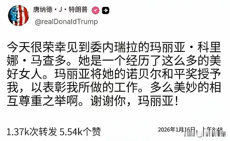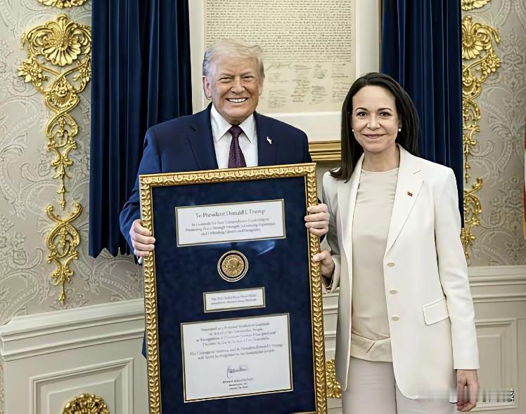 老特终于得到了他最想要的东西——诺贝尔和平奖,他最感谢的人,就应该是这个借花献佛的委内瑞拉反对派领导人马查多,从照片能够看得出来,特朗普心花怒放,特别的开心,因为这毕竟是他梦寐以求想得到的东西!