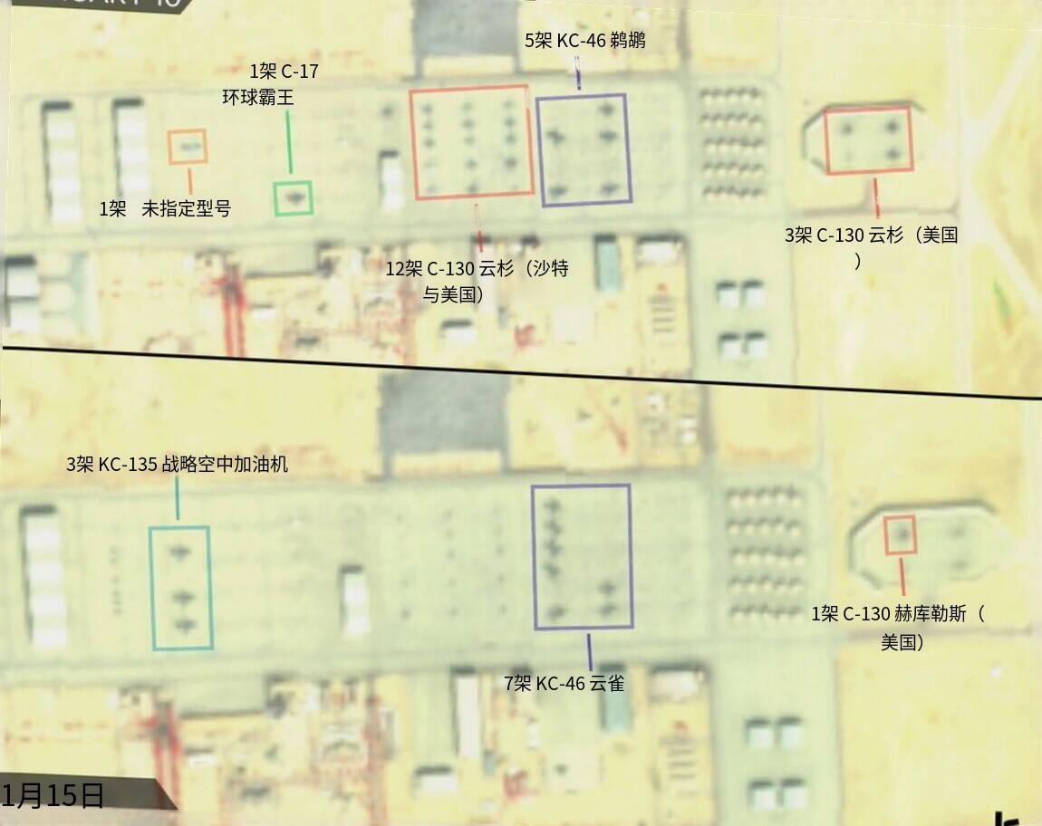 新闻快讯——美国与沙特已从沙特境内的苏丹王子空军基地撤离非必要飞机。 1月15日的卫星图像显示,基地目前仅剩余加油机,所有其他类型飞机均已撤离。
