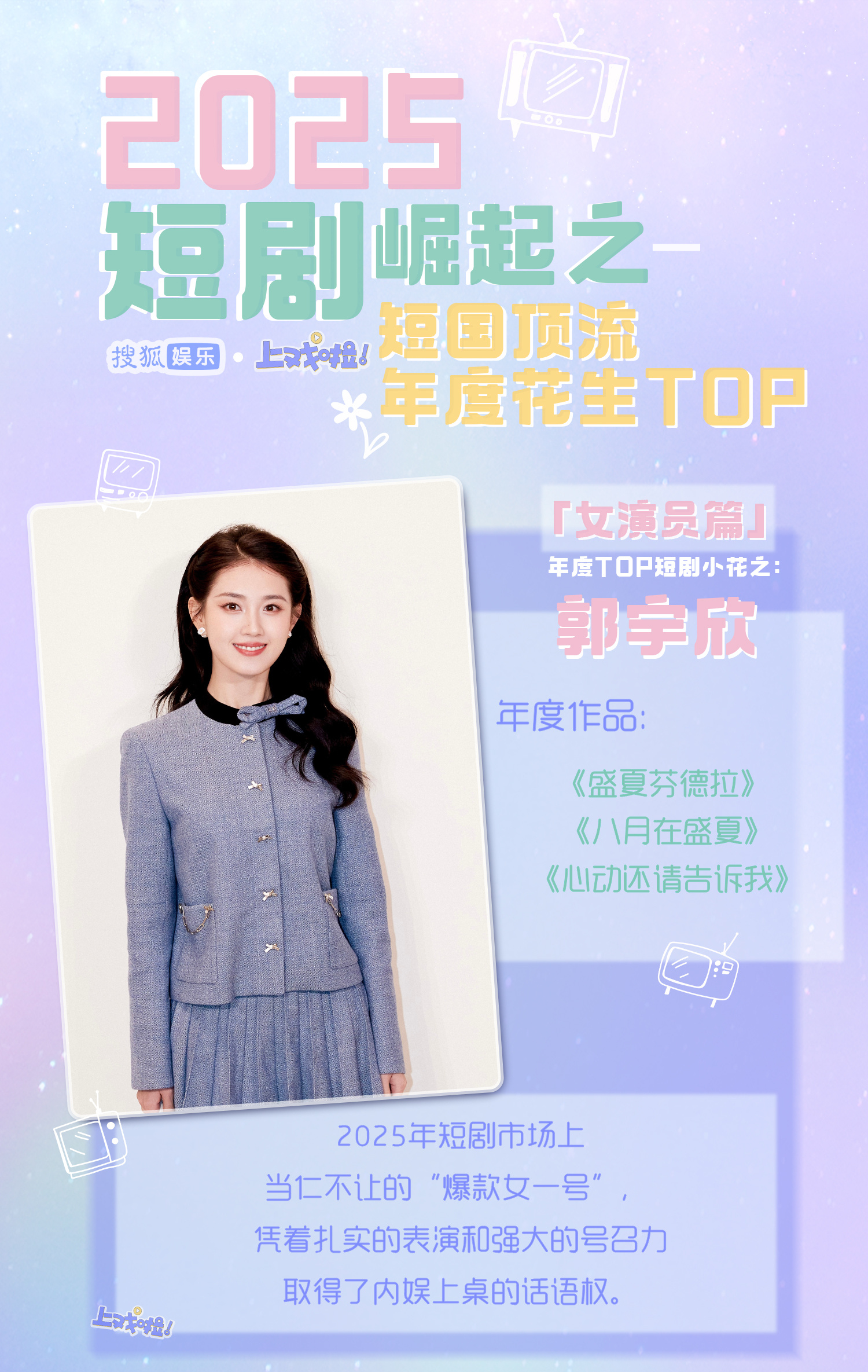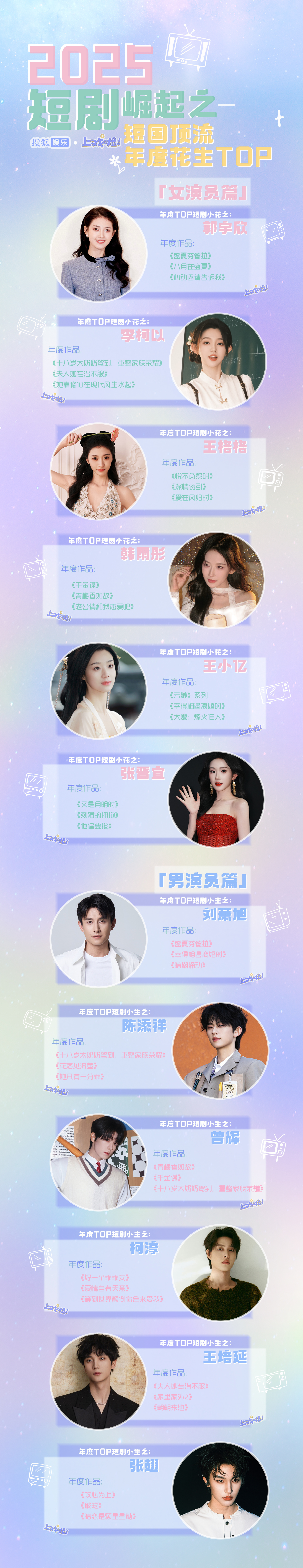 2025短剧演员给内娱补货了 内娱补货的风还是吹向了短剧演员TA们凭借着优秀的作品,实现口碑与热度的双丰收,成为搅动行业格局的 “新鲜血液”短剧正在告别野蛮生长,而这一切,需要这些年轻的、生动的、有着创造力和进取心的年轻演员们,去继续探索他们的表演边界年度TOP短剧小花: (排名不分前后)年度TOP短剧小生: (排名不分前后)