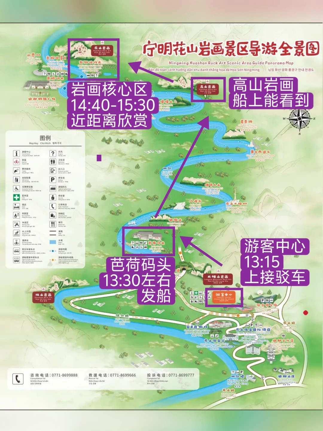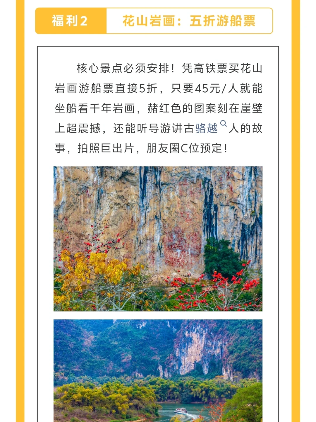 崇左过去11元,免费接驳车去景区,门票5折(45元含船票),免费体验花山温泉。