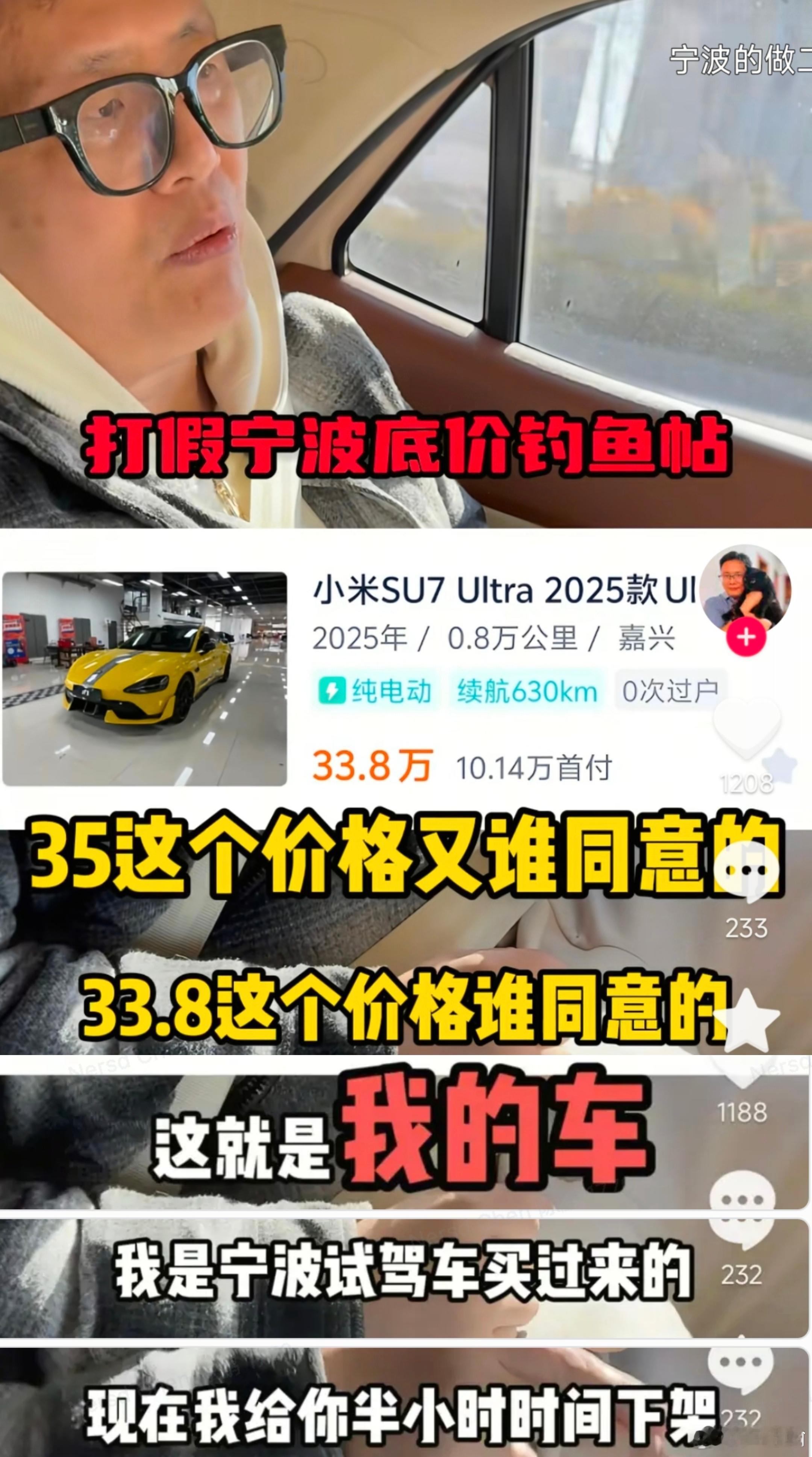 徐洁云转发辟谣低价能买二手小米车 看了一眼,这个套路其实是老套路了,只是没想到在二手车行业也有之前二手平台甚至租房平台这个模式都非常流行,就是低价挂一个优质品,骗用户咨询,等用户上门交易了,告诉你那个品卖掉了,这里有一个差不多的~很多人觉得来都来了,加上时间仓促来不及仔细看,就~~二手车这块,价格波动会更大,因为是否有事故,是否出过险、公里数多少、是否维修过等,同一款车价差会非常的大,这一块的水也会更深