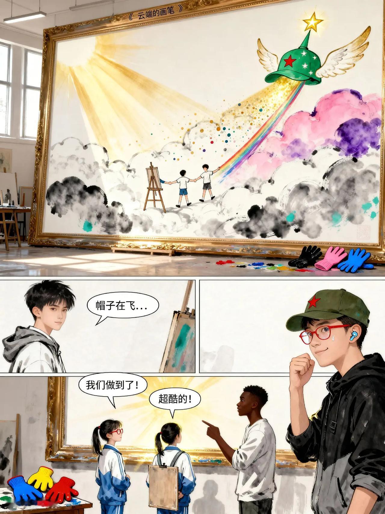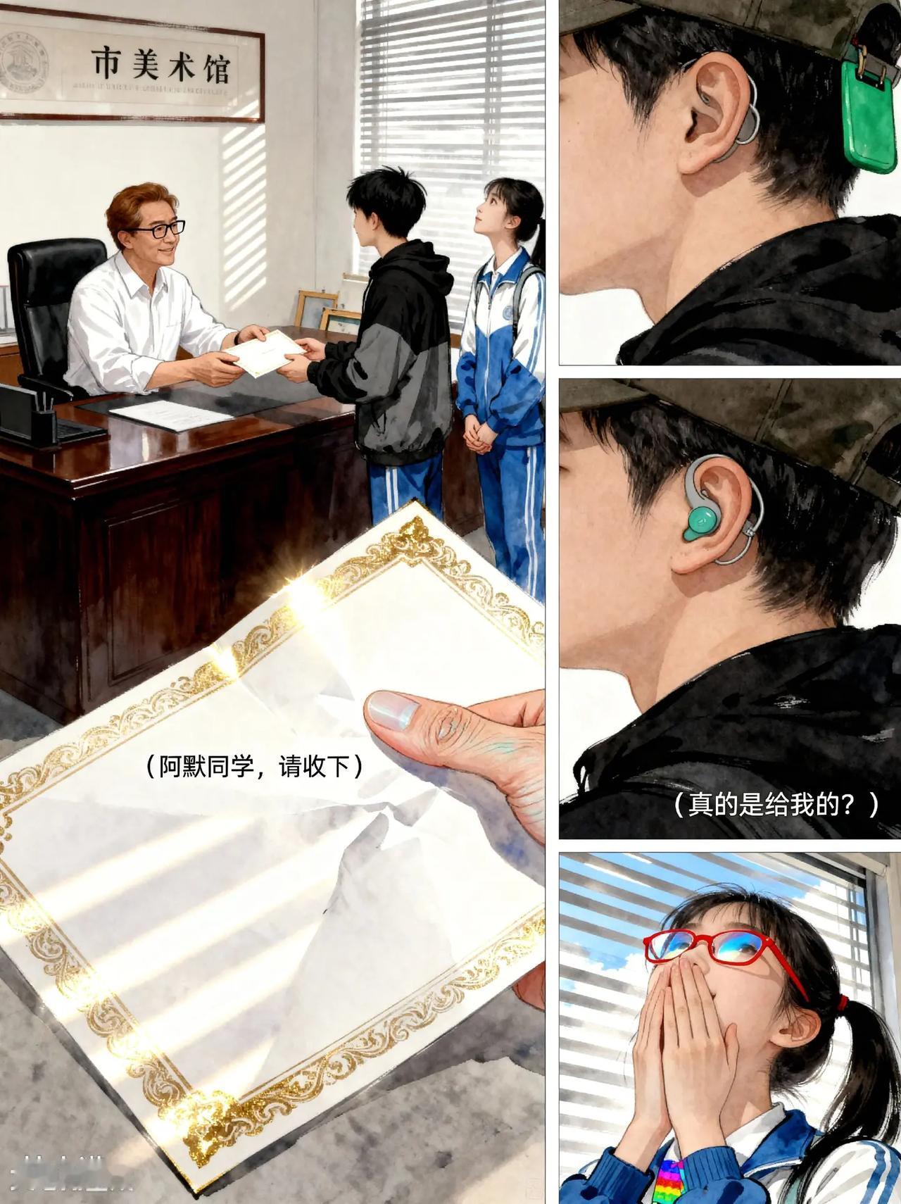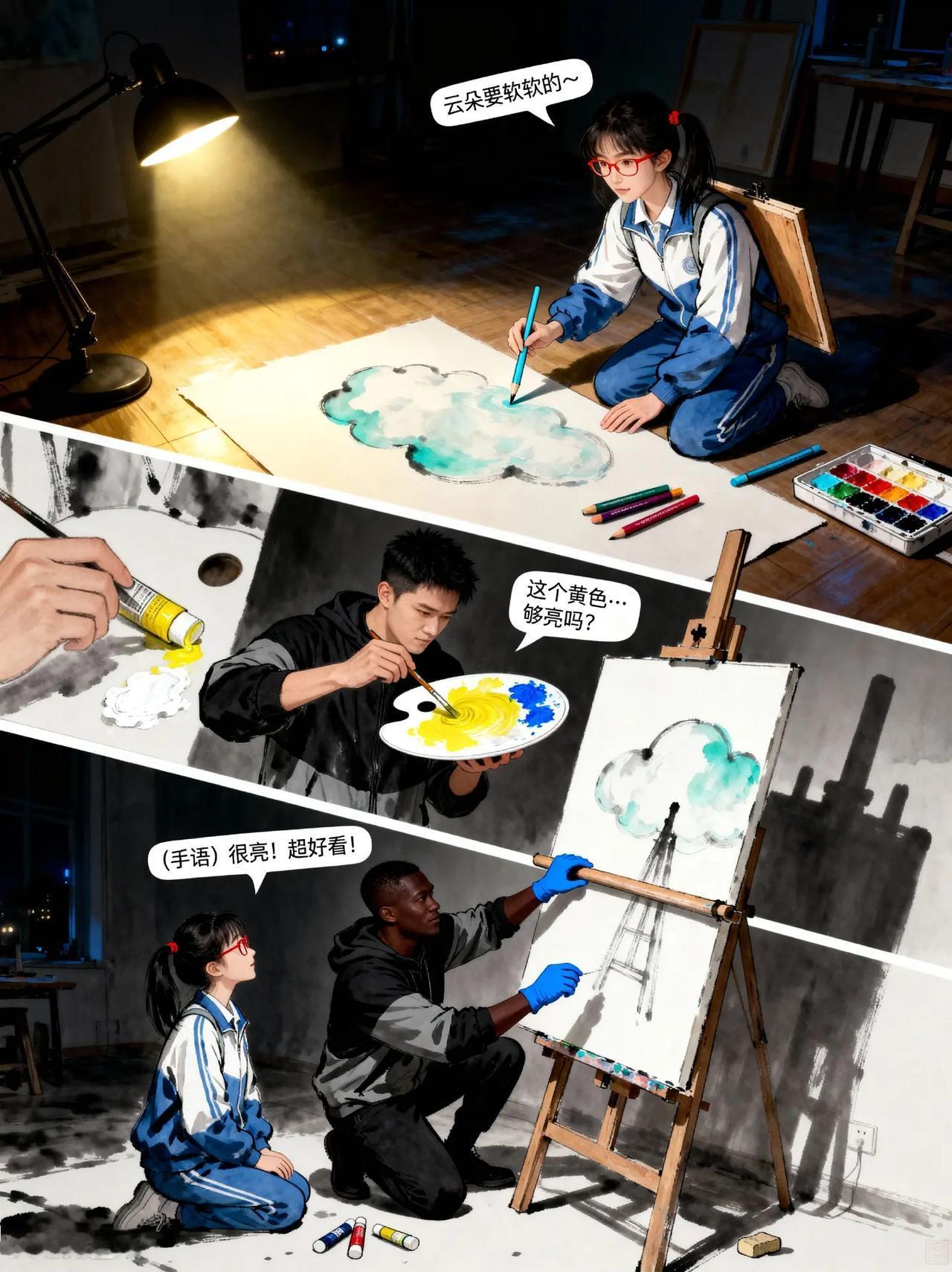 裂痕与光:画家向云端第9话。故事梗概:听障少年阿默与好友林小满、张强合作创作画作,克服创作瓶颈, 最终完成《云端的画笔》并在画展广受好评,展现友谊与梦想的力量。动画 残疾人 创作