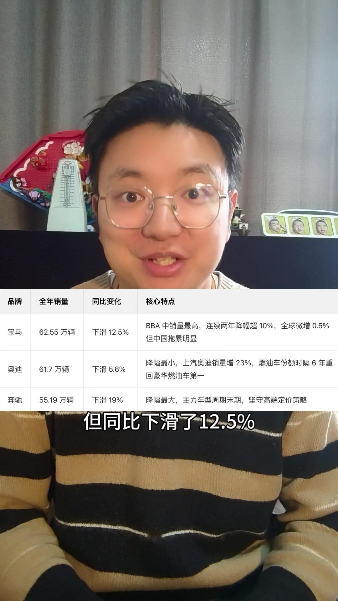 BBA中国销量大变动!🚗BBA中国2025年销量公布,三强集体遇冷。宝马以62.55万辆保住榜首,同比下滑12.5%;奥迪61.7万辆紧随其后,降幅5.6%为最小;奔驰55.19万辆,同比暴跌19%成降幅最大。