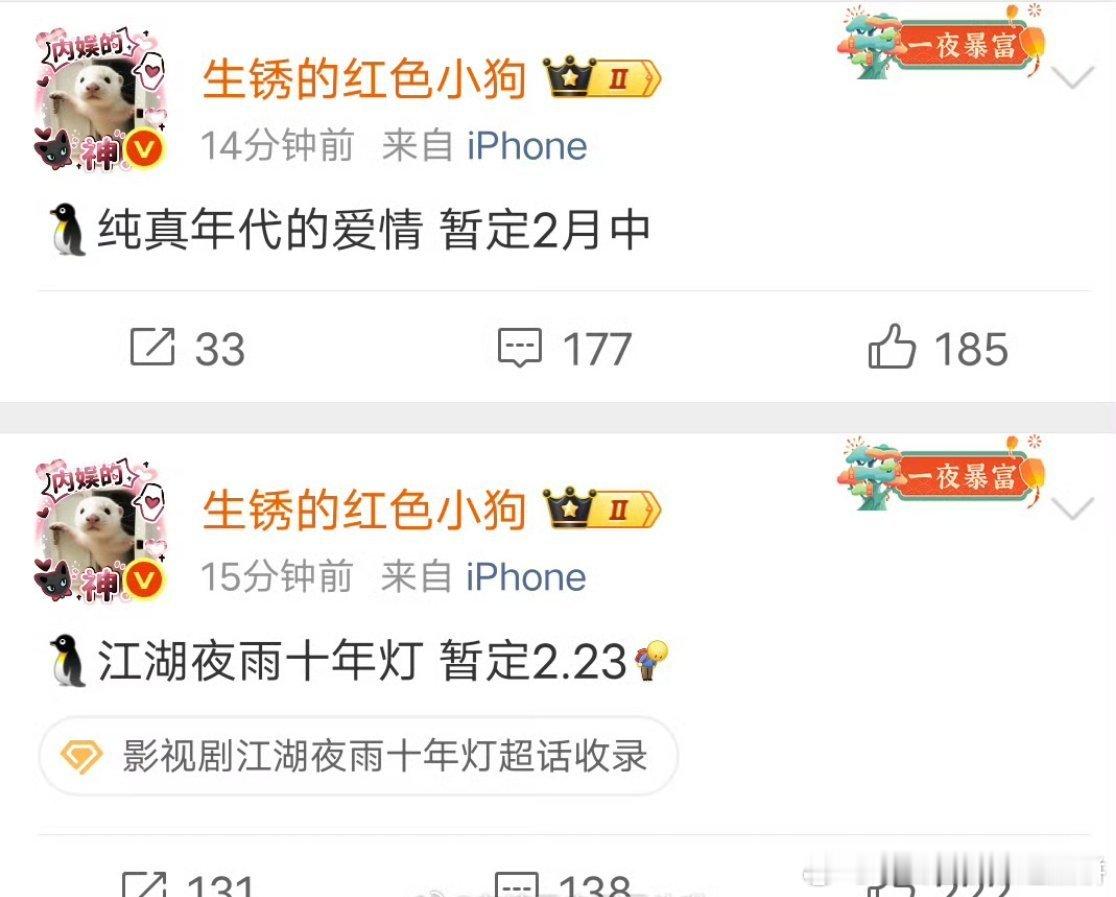 🍉鹅2月的排播计划陈飞宇 孙千《实用主义者的爱情》改名《纯真年代的爱情》暂定2月中旬周翊然 包上恩《江湖夜雨十年灯》暂定2月23日