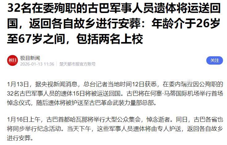 难怪古巴卫队保护不了马杜罗! 古巴官方公布32名牺牲人员信息后,很容易就能发现这里面的人员配置实在太反常,压根就不是去打硬仗的架势。 平均年龄44岁,不算年轻不说,职务构成更是离谱,2名上校、1名中校、4名少校、4名上尉,再加上7名中尉和3名少尉。 光军官就有21人,而士兵只有9个,这官比兵还多的队伍,别说对抗全副武装的正规军,就算是应付国内普通的安保活动都显得臃肿。 稍微懂点军事常识的都知道,打仗的部队讲究的是官兵配比合理,士兵是执行作战任务的主力,军官负责指挥协调,哪有军官数量远超士兵的道理? 这种配置更像是一群技术顾问或者监督人员,而不是冲锋陷阵的战斗部队。就说那2名上校,这级别可不算低了。 要是真的只是贴身保卫马杜罗,有一两个校级军官统筹协调就足够了,犯不着派两名上校过去。 合理的解释应该是,这些人各自负责不同的领域。 比如有的负责训练委内瑞拉本地安保人员,有的负责情报收集,有的负责制定安保方案,分散在不同的单位开展工作,并不是全都挤在马杜罗身边当贴身保镖。 其实了解古巴和委内瑞拉关系的人都清楚,古巴派这些人过去,核心是履行两国之间的合作协议,帮着马杜罗搭建靠谱的安保体系,而不是直接替他挡子弹。 毕竟马杜罗对自己本国的军队和卫队不太信任,才请古巴帮忙,这些古巴人员的核心价值是技术支持和经验指导,属于顾问性质的支援。 他们平时的工作可能是训练士兵、完善安保流程、排查安全隐患,而不是天天荷枪实弹守在马杜罗身边。 也正因为如此,当美军发动突袭的时候,这些古巴人员根本没法形成有效的战斗力量。 一方面是他们本身就不是作战部队,缺乏协同作战的训练和装备,面对美军这种专业的突袭部队,自然难以抵挡。 另一方面是他们分散在不同单位,没能集中力量形成防护屏障,只能各自为战,最终付出了惨重的代价。 反观马杜罗身边那些委内瑞拉本土的卫队,人数不少却没起到多大作用,要么是因为通信被美军干扰打乱了建制,要么是本身就没多少忠诚度,压根没怎么抵抗。 所以说,不是古巴卫队不拼命,而是这支部队从一开始的定位就不是正面作战。 32名牺牲人员里的那些军官,放在平时都是出谋划策的角色,真到了枪林弹雨的实战场景,就算再勇敢,也架不住配置不对路、力量分散。 这也解释了为啥明明有古巴人员帮忙安保,马杜罗最终还是被带走,本质上就是这支古巴队伍的职能的是顾问支援,而非实战保卫。 用这样的队伍去对抗正规军的突袭,本身就超出了他们的能力范围。 归根到底,还是马杜罗的安保体系存在先天缺陷,把希望寄托在一群顾问性质的人员身上,面对美军这种级别的突袭,自然难以招架。