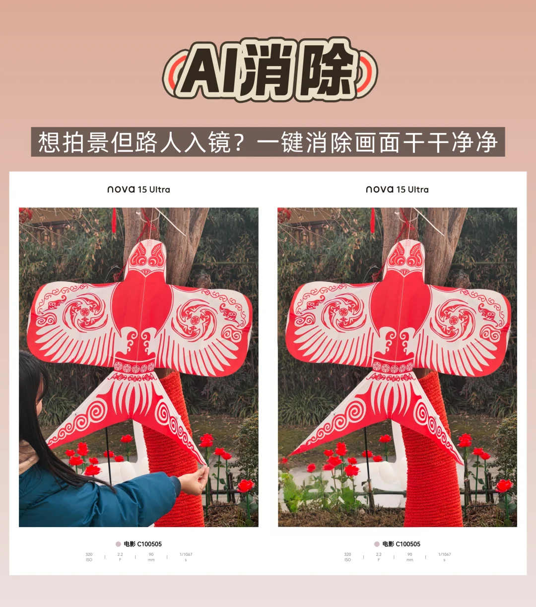 与其对着别人拍的美图嘶哈嘶哈,不如自己拿起手机拍一下~[斜眼R] 📸打开nova 15 Ultra的AI辅助构图,大片有手就会 📸不小心拍到路人也不要紧,用AI消除随手一划瞬间消失,还能智能补全画面不留痕 📸拍人像用一键精修,比自己吭哧吭哧P图省劲儿多了,主打一个自然出片,不假面还有满满的质感 有了这3个功能,咱手机里是真的很难有废片✌️ 你用这些功能拍过惊艳的照片吗? 欢迎来评论区晒图哟[萌萌哒R]