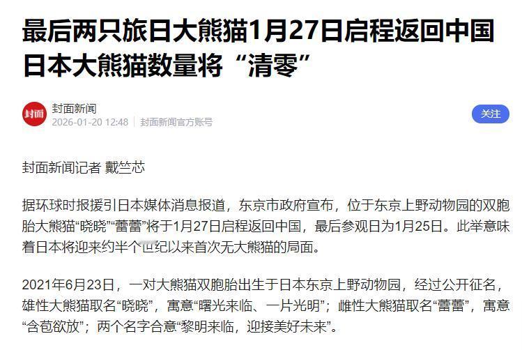 日本政府突然宣布! 最近日本东京都政府宣布,上野动物园那对双胞胎大熊猫27号就要启程回国,最后观看日定在25号。 消息一出来,不少人觉得就是租借协议到期的常规操作,可在我看来,这事儿压根没那么简单。 说白了,这就是中日之间政治互信彻底崩塌的明摆着的体现,比任何外交辞令都来得直接。 要搞明白这里面的门道,咱们得从根上捋捋这熊猫租借的来龙去脉。 早在2010年7月,中国野生动物保护协会就和东京都政府签了协议,把“比力”和“仙女”租给了日本,租期10年,每年租金95万美元。 当初这么做,核心就是为了推进中日之间的科研合作,熊猫说白了就是两国友好的“活名片”,承载的是双方的善意和互信。 后来这对熊猫在日本生下了包括这对双胞胎在内的后代,这些年日本民众也确实喜欢熊猫,上野动物园因为熊猫常年人气爆棚。 每年光靠熊猫相关的收入就有数百亿日元,可现在说提前归还要提前归,而且这一归,日本境内就暂时没大熊猫了,这背后的政治意味再明显不过。 可能有人会说,不就是提前一个月回国吗?至于上升到政治互信的高度吗?那你就太天真了。 熊猫外交从来都不是单纯的动物租借,从1972年中日邦交正常化后,中国把大熊猫“康康”和“兰兰”作为国礼送到日本开始,熊猫就一直是中日关系的“晴雨表”。 关系好的时候,熊猫就是传递温暖的纽带,比如2011年日本大地震后,咱们又送了熊猫过去,就是想表达慰问。 可现在关系冷到这份上,作为友好象征的熊猫,自然也就没了继续留在那里的意义。 尤其是现在的日本高市早苗政府,上台之后净干些触碰咱们底线的事儿,先是在国会发言里把“台湾有事”和日本的“存亡危机事态”绑在一起。 这明摆着就是干涉中国内政,咱们多次交涉,他们却压根不搭理。 到了2026年元旦,高市早苗发表新年讲话,提了和美国的合作,提了各种国际会议,偏偏对APEC期间和中国高层的互动只字不提,这种刻意的回避,就是在释放对华强硬的信号。 更让人没法接受的是,他们还就咱们的正常军演说三道四,试图把地区紧张的责任推到咱们身上。 在这种充满敌意和对立的政治氛围下,还指望熊猫租借这种基于善意的合作能继续下去,简直是痴心妄想。 再说说这次提前归国的细节,本来这对双胞胎的返还期限是2026年2月,可中方提出了提前一个月,日方也只能同意。 这背后其实是双方合作基础的彻底丧失,现在中日之间别说深化科研合作了,就连熊猫的健康保障、繁育研究这些基本的沟通都难以推进。 咱们现在对熊猫租借的要求越来越高,不仅要求租借国具备顶尖的饲养和医疗条件,还得积极配合中方的科研工作,定期提交健康报告,接受突击检查。 日本虽然饲养员还算细心,但在当前的政治氛围下,这些合作细节根本谈不拢,再加上日方之前更多是把熊猫当成赚钱的工具,在深度科研上没什么突破,和咱们现在的租借诉求早就不契合了。 更关键的是,对于一个公然挑战咱们核心利益、破坏战后国际秩序的政府,咱们不可能再用熊猫这种友好象征来传递善意,这不符合咱们的立场,也对不起熊猫所承载的友好意义。 所以说,这对旅日大熊猫提前回国,绝对不是简单的“租期到了”,而是中日政治互信彻底崩塌的具象化体现。 它用一种老百姓都能看懂的方式告诉我们,国家之间的合作,尤其是带有善意象征的合作,必须建立在相互尊重、坚守底线的基础上。 日方如果继续执迷不悟,在错误的道路上走下去,失去的可就不只是熊猫带来的经济利益了,经贸、文化等各个领域的合作都会受到影响。 咱们中方的态度一直很明确,原则问题不让步,合作必须讲诚意,熊猫的离开就是最直接的信号,日方该好好醒醒了,别等失去更多才后悔。
