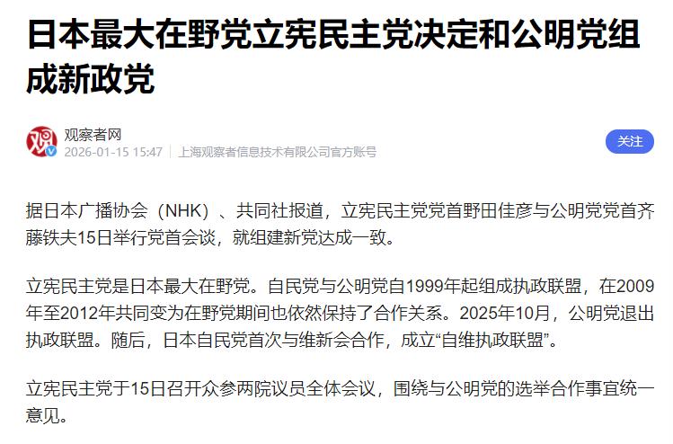 日本政坛要变天了! 高市早苗要完蛋? 在我看来,日本政坛这波操作真是应了那句“墙倒众人推”。 2026年1月15号深夜十点,东京永田町传出来的消息直接让全世界都炸了锅,这哪里是什么普通的政治变动,分明就是一场冲着高市早苗政府来的“政治海啸”。 说白了,之前大家还猜高市早苗能不能稳坐首相宝座,现在看来根本不用猜了,日本内部已经把矛头明晃晃地对准了她。 连曾经跟自民党绑在一根绳上的盟友都反水了,这局势变天变得比翻书还快。 以前高市早苗所在的自民党能稳稳执政,靠的就是和公明党的联盟,公明党可是自民党执政的重要基石,俩人之前好得跟穿一条裤子似的。 可谁能想到,这次公明党竟然直接跟最大的在野党立宪民主党抱在了一起,15号下午,立宪民主党的党首野田佳彦和公明党的党首齐藤铁夫当着所有人的面紧紧握了手。 随后就在国会开了联合记者会,正式宣布要组建一个叫“中道改革”的新党。 这举动可不是简单的政党合作,明眼人都能看出来,这就是一场针对高市早苗政府的公开宣战,等于把“要赶高市早苗下台”这事儿摆到了台面上。 为啥这俩党会突然联手对付高市早苗呢?核心还是高市早苗上台后太能折腾了,把日本政坛搅得鸡犬不宁。 她一上台就一个劲地往右转,搞各种激进的安保政策,之前公明党就是因为看不惯她这股极端右翼的劲儿,去年10月就退出了和自民党的执政联盟。 现在高市早苗又放话要在1月23号解散众议院重新大选,想靠选举赌一把巩固自己的地位,这可把在野党逼急了。 立宪民主党本来就是最大的在野党,一直想找机会制衡自民党,现在公明党主动递橄榄枝,俩党一拍即合,就是要凑够力量在大选中跟高市早苗的执政联盟拼到底。 说句实在的,这两党联手可不是闹着玩的,各自都有实打实的本钱。 立宪民主党背后有日本最大的工会支持,基本盘稳得很,而公明党在地方上的动员能力特别强,尤其是能拉到不少中老年选民的票。 更关键的是,以前公明党跟自民党合作的时候,在很多选区都会帮自民党候选人拉票,现在反过来帮立宪民主党,这对高市早苗所在的自民党来说可是致命打击。 要知道日本众议院选举,小选区的席位占了六成以上,以前自民党靠公明党的支持才能在不少选区稳住阵脚,现在这根靠山没了,甚至变成了对手,那些原本就竞争激烈的选区,自民党大概率要栽跟头。 高市早苗现在的处境是真的难,可谓是内忧外患一大堆。内部自民党的黑金丑闻还没彻底翻篇,民众对这个党早就有了“腐败、守旧”的坏印象。 她自己除了靠炒作对华强硬这种民粹话题博眼球,根本拿不出解决经济问题的实招。 现在日本的通胀率还维持在3.1%,物价一个劲地涨,工资却跟不上,老百姓最关心的养老金、医疗保障问题一个都没解决,大家早就对她那套“口号式执政”烦透了。 外部又遇上在野党抱团绞杀,新成立的“中道改革”党直接主打民生牌,一下就戳中了选民的痛点,这无疑是给高市早苗的大选之路蒙上了一层厚厚的阴影。 可能有人会说,高市早苗不是还有32%的支持率吗? 可别被这数字骗了,这支持率大多是靠煽动民族情绪换来的短期热度,根本不牢固。 选民投票看的是能不能让自己的日子好过,不是看谁喊口号喊得响。现在日本民众心里跟明镜似的,谁能解决物价、工资、养老这些实际问题,他们就把票投给谁。 高市早苗想靠解散众议院大选赌一把,可她手里根本没什么像样的筹码,反而把自己的仕途都押了进去,说达不到执政联盟半数席位就辞职,这简直就是一场豪赌。