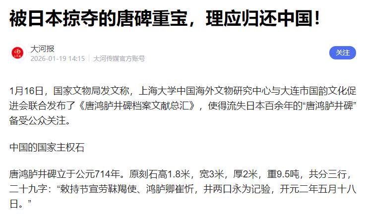 中国放弃呼吁,直接给日本下了最后通牒! 要求日本无条件、立即归还唐鸿胪井碑,那绝对是忍无可忍、无需再忍了,这背后藏着的是我们捍卫领土主权和历史尊严的坚定决心。 可能有些朋友不清楚这块石碑的分量,说白了,它根本不是什么普通的古董摆件,而是一千三百多年前大唐王朝立下的“国土界碑”。 是咱们中国对东北边疆拥有管辖权的铁证,这可不是随便说说的,每一个字都刻着历史真相。 想当年,也就是大唐开元二年,鸿胪卿崔忻奉了皇帝的命令北上,册封东北的地方首领,为了记下这件确立中央政权管辖的大事。 就在旅顺黄金山的岩壁上立了这块重逾九吨的黑色巨石,碑上那二十几个苍劲的汉字,就像一枚钢印,把大唐对东北的主权牢牢焊在了这片土地上。 也成了中国领土主权最原始的“身份凭证”。 这么说吧,这块碑在那立着,就明明白白告诉世人,从一千三百多年前开始,东北那片土地就归中国管,这是铁打的历史事实,谁也篡改不了。 可偏偏日本不怀好意,把这块象征着我们国土主权的界碑硬生生抢回了自己的皇宫,这哪里是抢一件文物那么简单,分明是想偷我们的边疆历史。 想把这段铁一般的主权历史从咱们的记忆里抹掉,这种心思简直歹毒得很。 可能有人不知道,日本抢这块碑的过程根本不是什么“合法获取”,完全是强盗行径。近代的时候,日俄战争在中国东北打了起来,我们清政府弱,没办法捍卫自己的主权。 只能眼睁睁看着列强在咱们的土地上争夺。日本打赢之后,就把旅顺给占了,然后就盯上了这块唐鸿胪井碑。 他们早就知道这块碑的历史价值,专门派人鉴定,之后就用暴力手段把这块近十吨重的巨石切割开,偷偷运到了日本,最后藏在了皇宫里,还美其名曰是“战利品”。 可话说回来,这是我们中国的文物,跟当时的俄国一点关系都没有,日本凭什么把它当战利品? 这就是赤裸裸的掠夺,是对中国主权的公然侵犯。更可气的是,二战结束后,日本居然还厚着脸皮把这块碑说成是自己的“国有财产”。 这简直是颠倒黑白,单方面的认定根本改变不了它是中国流失文物的本质。这些年,我们一直通过各种渠道呼吁日本归还这块碑。 可日本要么装聋作哑,要么找各种借口推脱,把我们的善意和克制当成了软弱可欺。 现在不一样了,中国已经不是当年那个任人宰割的弱国了,我们有足够的实力和底气捍卫自己的合法权益,所以这次才不再客气,直接下达通牒,要求他们无条件、立即归还。 这通牒背后,是我们对历史真相的坚守,是对领土主权的捍卫,更是对日本这种强盗行径的严厉驳斥。 要知道,联合国教科文组织早就有公约规定,战争期间被掠夺的文物,必须归还原属国,日本作为国际社会的一员,没有任何理由违反这个规定。 而且,我们的学者早就搜集了铁证,从当年崔忻立碑的正史记载,到日军运输石碑的军舰日志,再到石碑在日本皇宫的藏匿位置,每一份证据都清清楚楚,无可辩驳。 说白了,日本藏着的不是一块石头,而是一段被他们非法囚禁的中国历史,现在是时候让这段历史回家了。 我们这次下达通牒,就是要告诉日本,关于领土主权和历史尊严的问题,我们没有任何商量的余地,这笔账欠了一百多年,今天必须算清楚。 也让全世界看看,中国捍卫自己核心利益的决心从来不是说说而已,任何国家想侵占我们的文物、篡改我们的历史,都是绝对不可能得逞的。 日本要是识相,就应该乖乖听从通牒,立即把唐鸿胪井碑归还给我们,这才是尊重历史、尊重中国主权的正确做法。 要是还想继续拖延、抵赖,只会让自己在国际上更加孤立,也必然会遭到中国人民的坚决反对和唾弃。