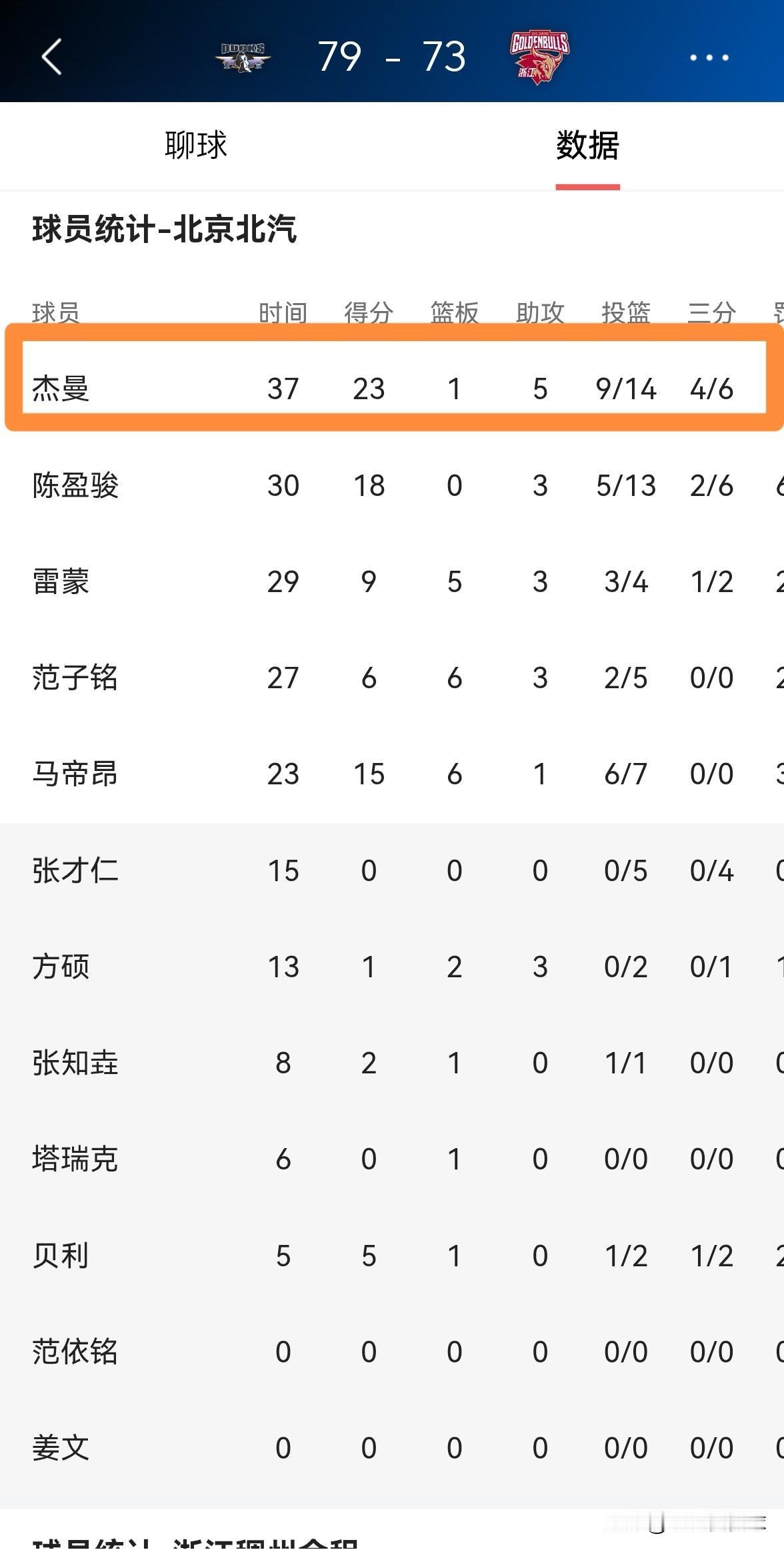 北京北汽外援杰曼不愧是当今CBA的顶级得分手!今天北京北汽在主场以79:73战胜浙江稠州金租,此役杰曼的状态非常的出色,他在首发出战的37分钟里,投篮14中9,其中三分球6中4、罚球2中1轰下23分5助攻3抢断,他的场上正负值为+13。 本场比赛杰曼在三分线外的表现真是让人叹为观止,他命中的四记三分球全都是高难度的进球,让人看的非常过瘾。