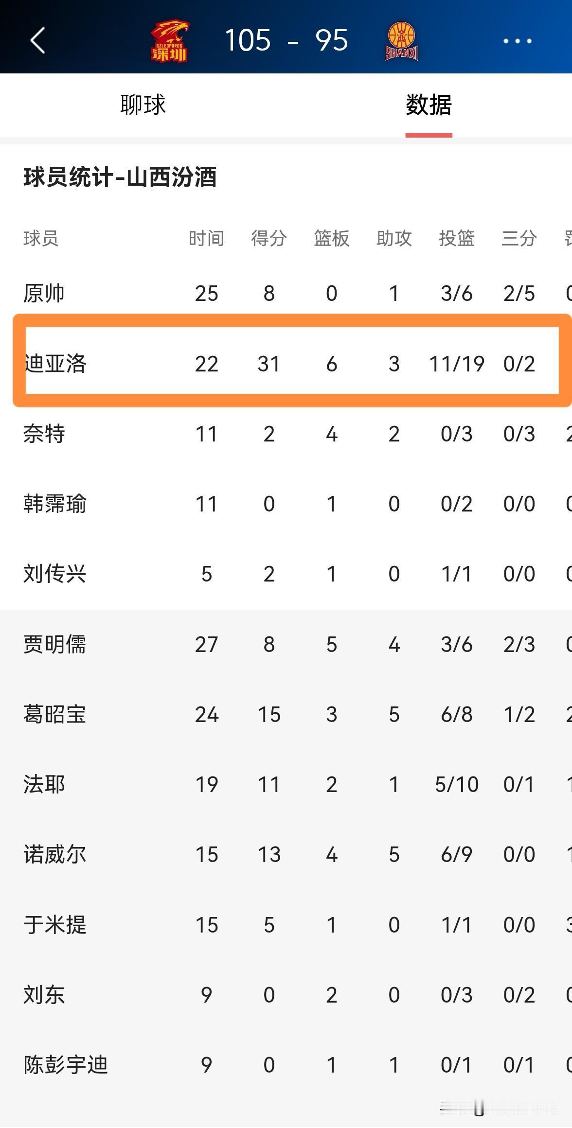 山西汾酒超级外援迪亚洛真是独木难支!在今天山西汾酒客场以95:105不敌深圳马可波罗的比赛中,迪亚洛在攻防两端都倾其所有却依然回天乏术。 全场比赛下来,迪亚洛首发出战22分钟,投篮19中11,其中三分球2中0、罚球12中9空砍31分6篮板3助攻。 不得不说,在张宁因伤缺阵的情况下,迪亚洛想要带领球队击败实力不俗的深圳马可波罗真是太难了。