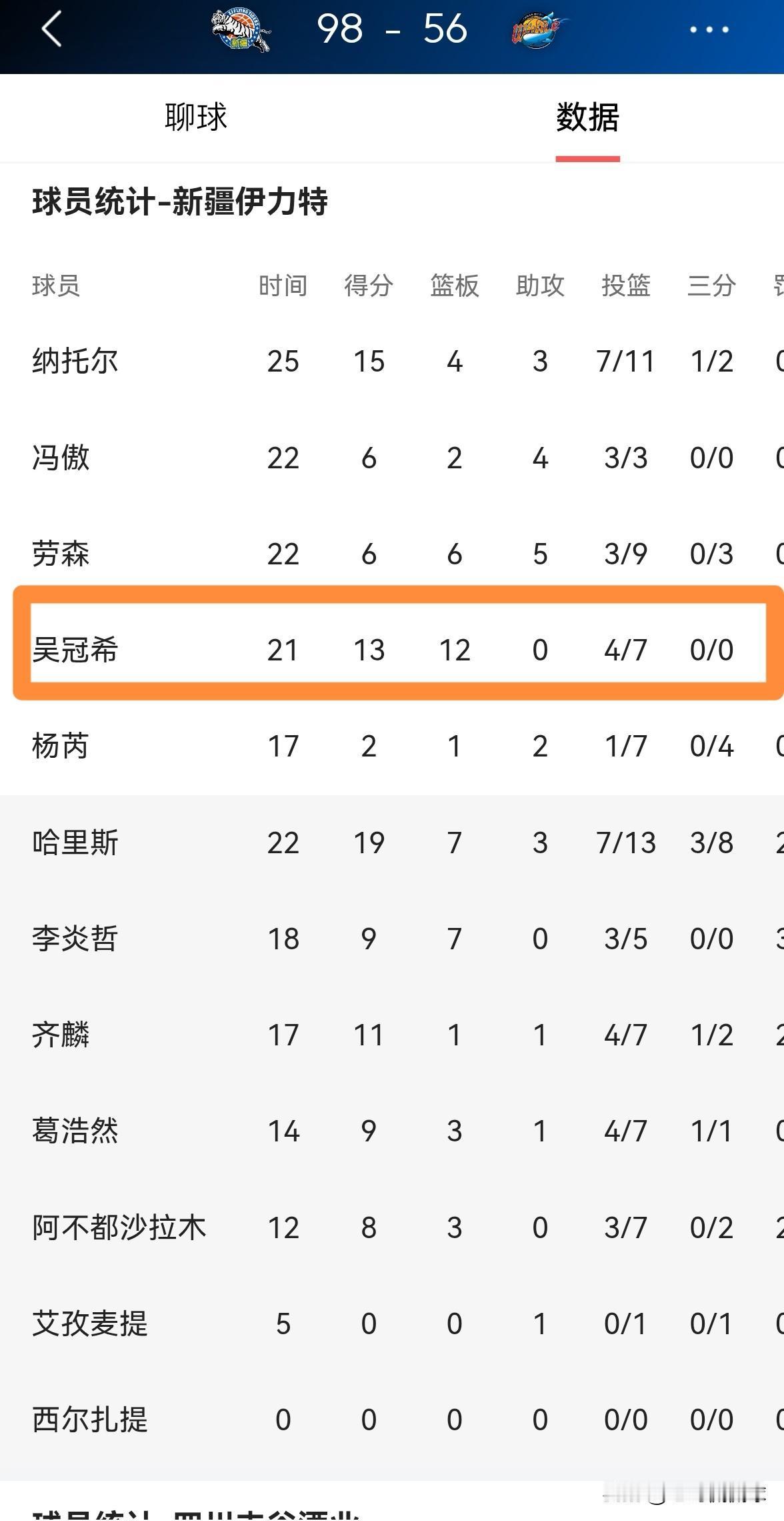 我忍不住要怒赞新疆伊犁特老将吴冠希!在今天新疆伊犁特主场以98:56大胜四川丰谷酒业的比赛中,31岁的吴冠希打出了非常高效的表现。 整场比赛下来,吴冠希首发出战21分钟,投篮7中4,其中罚球8中5砍下13分12篮板1抢断,他的场上正负值为+18。 值得一提的是,本场比赛吴冠希拼抢到了5个前场篮板,他凭借着一己之力为球队创造了多个二次进攻的机会。