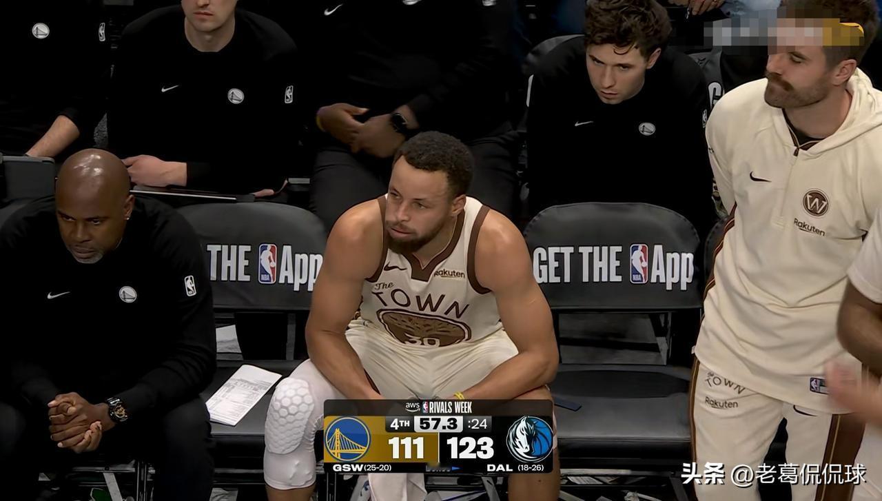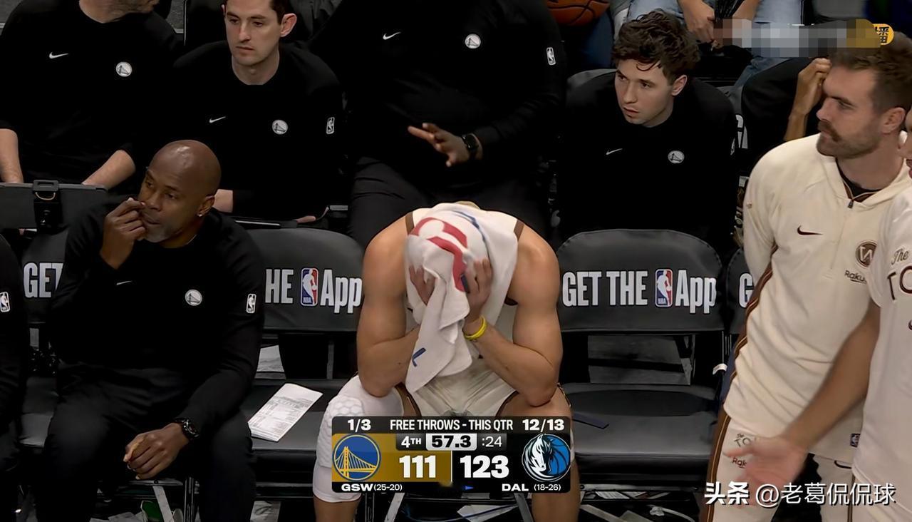 在今天勇士客场挑战独行侠的比赛中,发生了让人无比心碎的一幕。当时距离全场比赛结束还剩最后的57.3秒,勇士以111:123落后对手12分,基本上败局已定了。这个时候转播镜头给到了勇士的替补席,只见此役砍下38分的库里先是用毛巾搭在脑袋上看起来极其的沮丧、失落和无奈,接着库里神情落寞的看着场上的比赛,他的眼神里充满了失望,让人看着特别的心碎。