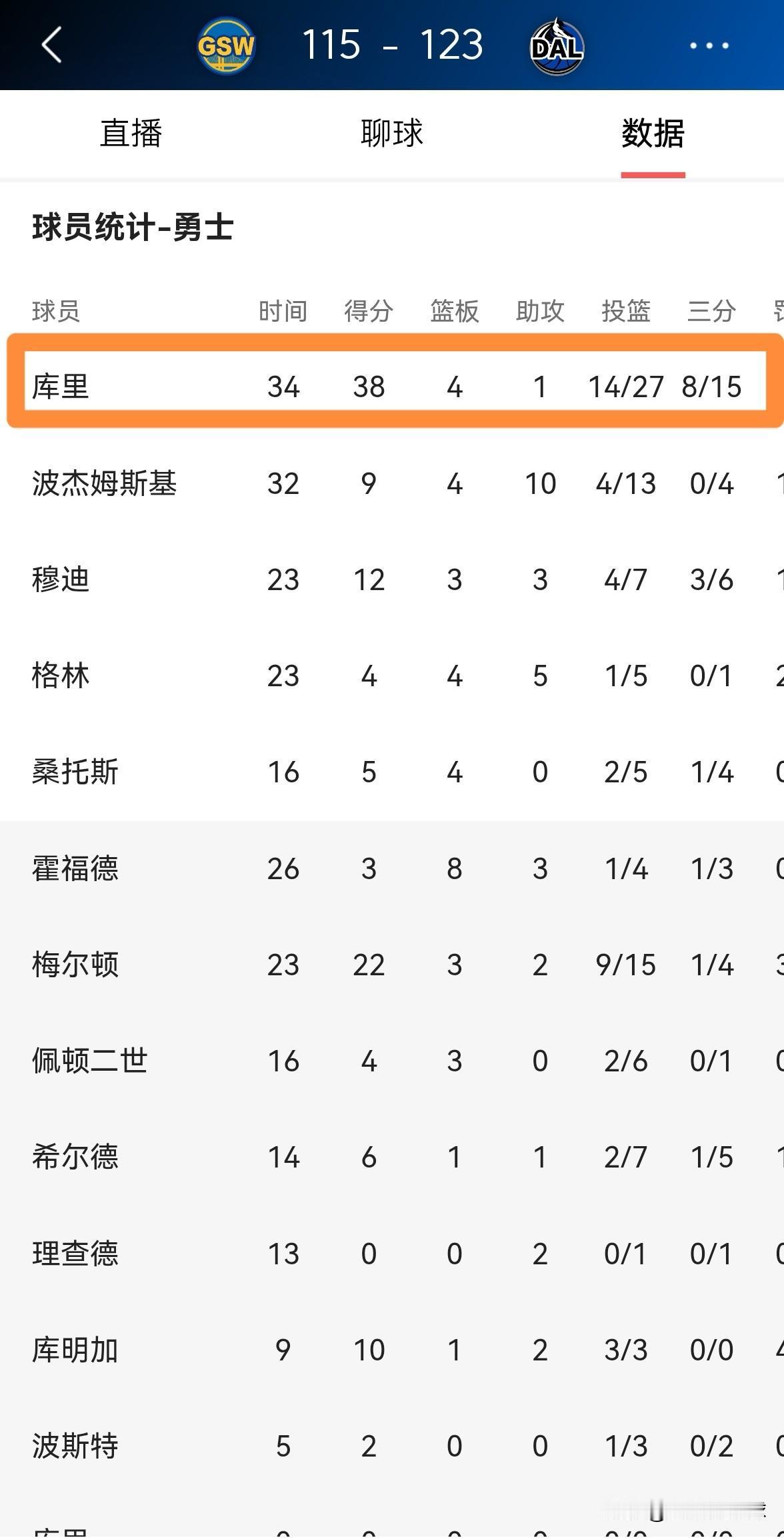 勇士超级巨星库里真是回天乏术!虽然今天勇士在客场以115:123输给了独行侠,但是库里在进攻端竭尽全力,最终只能是回天乏术。 全场比赛下来,库里首发出战34分钟,投篮27中14,其中三分球15中8、罚球2中2砍下38分,还有4篮板,不过他的场上正负值为-24。 在巴特勒因伤赛季报销的情况下,库里真是独木难支,如果勇士还想继续保持竞争力,那么球队必须为库里引进一名实力强劲的帮手。