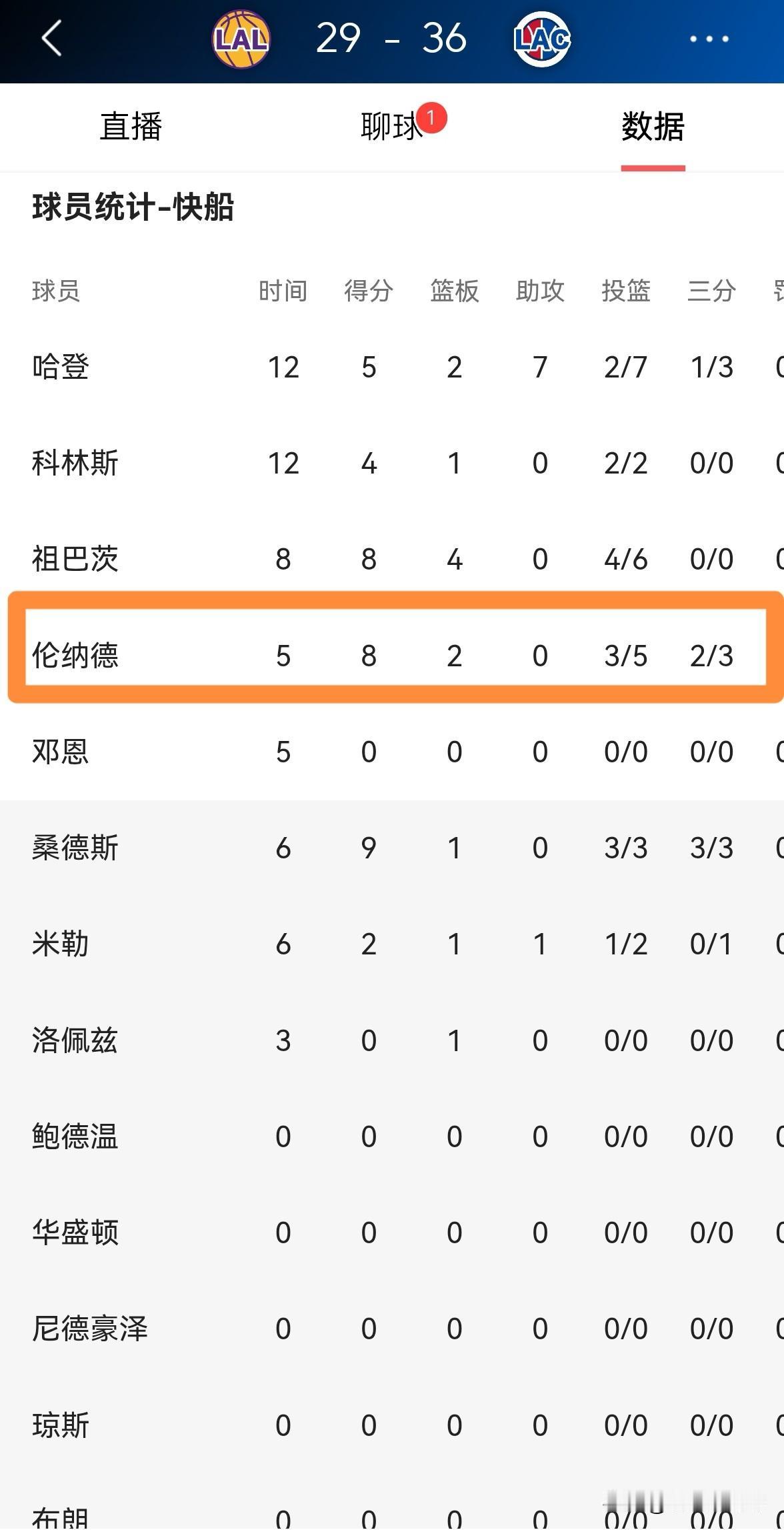 我严重怀疑快船巨星伦纳德炸伤!在今天快船主场迎战湖人的焦点战中,目前双方的第一节比赛已经结束,快船以36:29领先对手7分。值得一提的是,伦纳德在因伤缺阵几场比赛之后伤愈复出,他在第一节比赛中首发出战5分钟,投篮5中3,其中三分球3中2非常高效的砍下8分,还有2篮板。 值得一提的是,伦纳德在第一节比赛中得到的8分是连续得到的,以伦纳德在首节比赛中的火热状态来看,我严重怀疑他之前是炸伤。