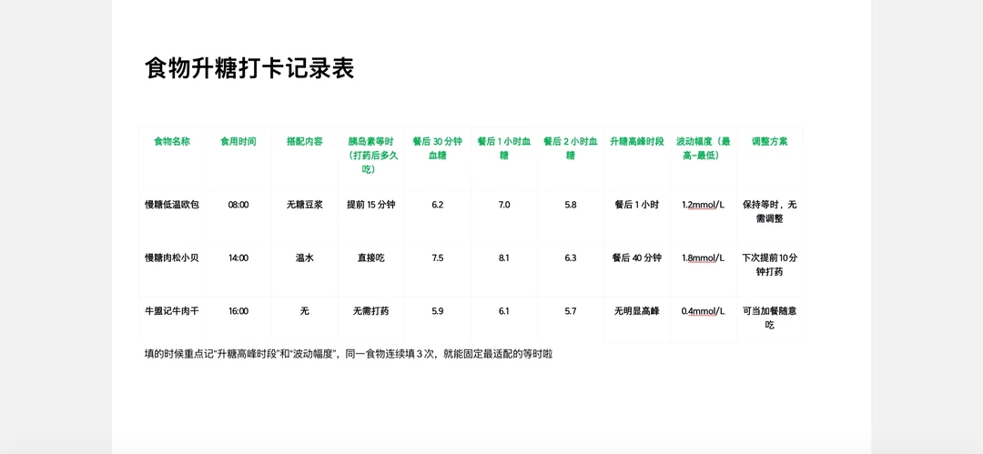 食物名称、食用时间、搭配内容、胰岛素等时(打药后多久吃)、餐后30分钟血糖、餐后1小时血糖、餐后2小时血糖、升糖高峰时段、波动幅度(最高-最低)、调整方案