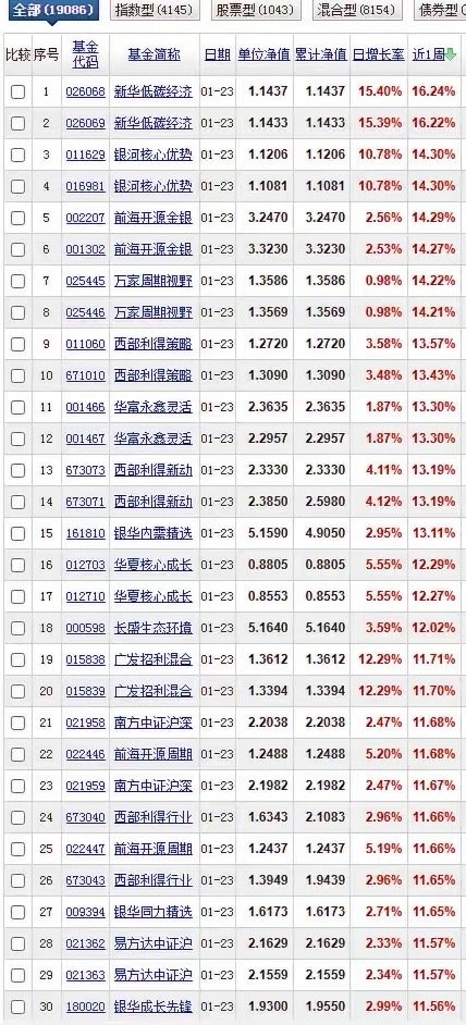 月榜和周榜我们放在一起统计。月榜方面,西藏东财景气驱动62.25%排名月榜第一,前海开源沪港深强国产业57.16%排名第二,永赢高端装备54.13%排名第三,中加优势企业49.90%排名第四,金信景气优选47.02%排名第五,汇安价值蓝筹46.93%排名第六,国投瑞银白银期货46.67%排名第七,诺安研究精选44.45%排名第八。周榜方面,变化就很大了,新华低碳经济16.24%排名第一,银河核心优势14.30%排名第二,前海开源金银珠宝14.29%排名第三,万家周期视野14.22%排名第四,西部利得策略13.57%排名第五,华富永鑫13.30%排名第六。
