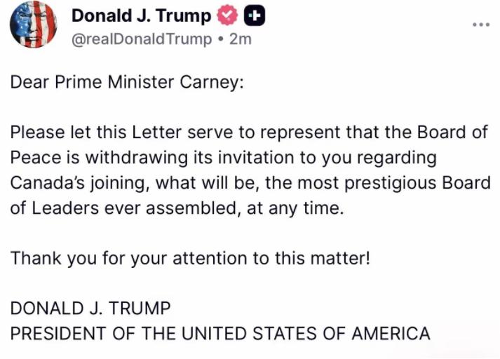第一个被特朗普踢出“小群”的国家出现了! 特朗普刚折腾着搞起所谓的 “和平委员会”,邀请了一堆国家加入,结果不少国家还在那儿观望琢磨,这边就先出了大岔子。 第一个被驱逐的国家直接冒了出来,不是别人,正是之前已经松口同意加入的加拿大。 这事儿说起来一点都不意外,明眼人都能看出来,特朗普这是典型的顺我者昌逆我者亡,根本容不得半点违逆。 要说清楚这事儿的来龙去脉,还得从加拿大总理卡尼前不久在达沃斯论坛的演讲说起。 本来卡尼之前已经公开表态,原则上同意加入这个 “和平委员会”,当时不少人还以为美加关系能稍微缓和点,谁能想到转头卡尼就来了个硬气表态。 在达沃斯论坛上,卡尼当着一众国际嘉宾的面,直接批评当下有些大国把经济一体化当裹挟他国的工具。 虽然没直接点名,但明摆着就是在说美国的霸权行径,还号召中等强国认清现实,团结起来对抗这种霸权。这番话一出口,现场不少人都起立鼓掌,这无疑是给了特朗普一个大大的下马威。 特朗普是什么性格?向来都是他欺负别人、羞辱别人,啥时候受过这种气?卡尼敢公开叫板,还号召大家一起对付他,这在他看来就是典型的倒反天罡,根本忍不了。 果不其然,卡尼这边演讲结束没按计划和特朗普见面,直接提前回国,那边特朗普就炸了锅。 当场就在自己的社交平台上发声明,硬生生撤回了对加拿大加入 “和平委员会” 的邀请,加拿大就这么成了第一个被公开踢出局的国家。 说起来这 “和平委员会” 打从一开始就透着不靠谱,特朗普本来是想靠这个组织彰显自己的国际影响力。 结果筹备过程乱得一塌糊涂,之前还闹过把比利时硬塞进签约国名单,最后被比利时官方公开否认的乌龙。 现在又因为领导人的个人恩怨随便驱逐成员国,这样的组织别说推动和平了,能不能长久存在都是个问题。 更让人看不明白的是,这个所谓的 “和平委员会” 还搞付费入会那一套,想成为永久成员国得交一大笔钱。 说白了就是特朗普把国际组织当成了做生意的工具,满脑子都是商人逻辑,根本没把国际公平正义当回事。 卡尼这边也没怂,回国后再次公开表态,说加拿大的未来只能由加拿大人自己决定,绝不会依附任何外部势力,更不会接受无端胁迫。 这一下就让美加关系彻底降到了冰点,也让其他还在观望的国家心里犯了嘀咕,原本就对这个组织持怀疑态度的国家,现在更得重新掂量掂量了。 毕竟连美国的传统盟友都能说踢就踢,谁知道自己哪天会不会因为一点小事就得罪特朗普,落得同样的下场。 其实这事儿背后反映的根本问题,还是美国霸权主义那一套已经越来越行不通了。 特朗普想靠自己的强势态度掌控一切,把国际事务当成自家生意来打理,不顺心就翻脸,这种做法根本违背了国际交往的基本准则。 卡尼的表态和被驱逐,恰恰说明现在越来越多的国家开始认清美国霸权的真面目,不再愿意一味妥协退让。 现在再看这个 “和平委员会”,经此一闹,国际形象算是彻底毁了。特朗普本想靠它捞取政治资本,结果反而暴露了自己的控制欲和霸权本质,还让美国和传统盟友之间的裂痕越来越大。 那些还在观望的国家,看到加拿大的下场,估计更不敢轻易点头加入了。说到底,国际社会需要的是公平公正的国际秩序,是真正能推动和平发展的国际合作。 而不是这种靠霸权裹挟、凭个人喜好操控的 “私人俱乐部”,特朗普想靠这种小伎俩摆弄国际格局,终究是行不通的。