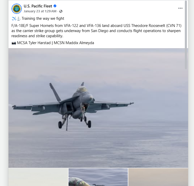 美国海军学会新闻网更新的美军航母位置情况,与20日的情况相比,林肯号到达中央司令部任务区,布什号继续进行部署前的检验演习。值得注意的是,西海岸的罗斯福号航母于1月21日也出港开始训练了。