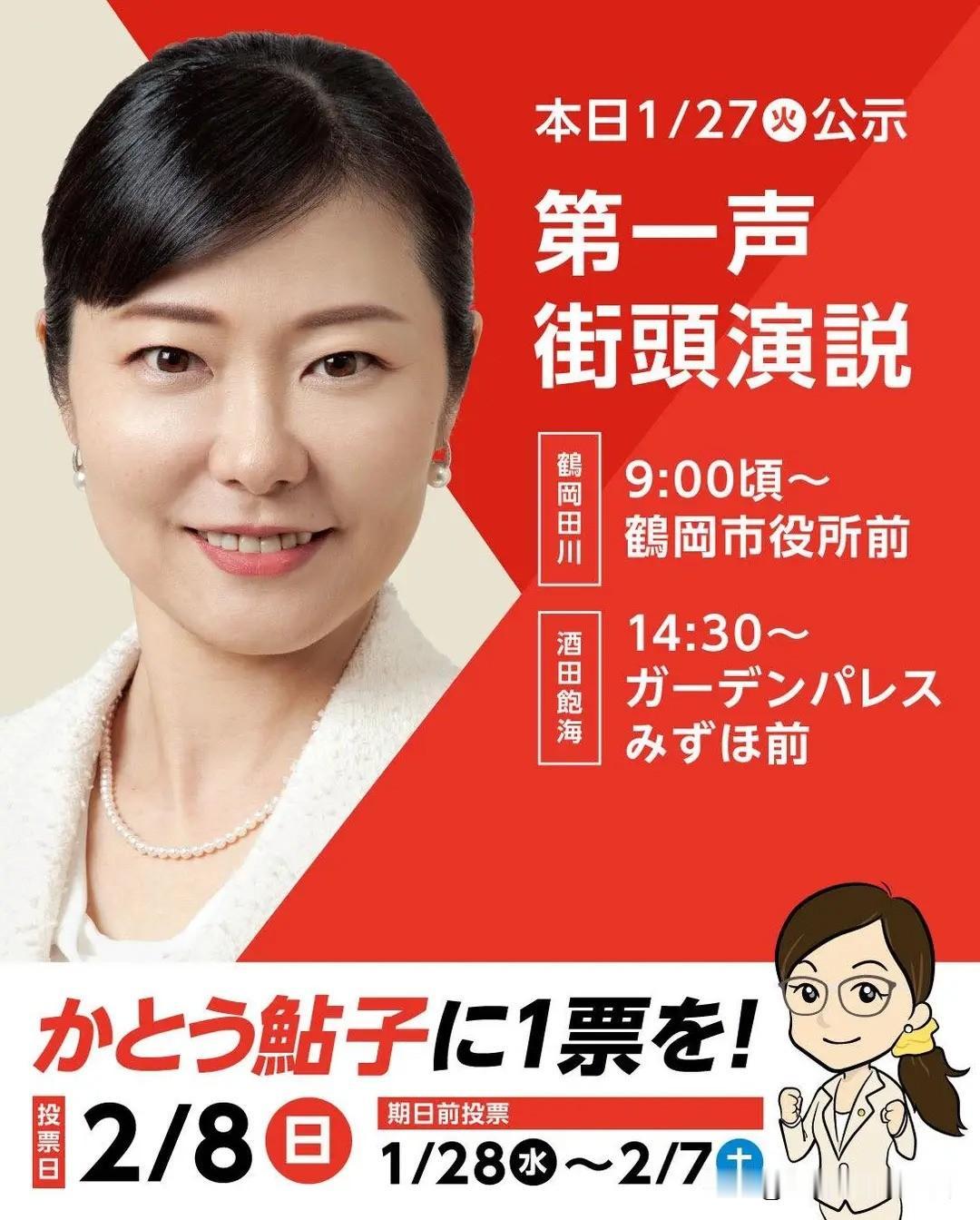 前日中友好协会会长、自民党前干事长加藤紘一的女儿加藤鲇子的众议院选举之路已经开始! 加藤鲇子,1979年4月出生,4届日本众议院议员,她的选区在山形县第三区。加藤鲇子曾任第二次岸田改造内阁特命担当大臣。其父加藤紘一,曾任日本自民党干事长、加藤派会长,日中友好协会会长,2016年去世!加藤鲇子现任日中友好议员联盟常任干事!