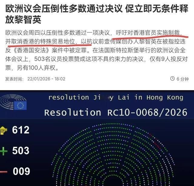 不允许对黎智英判刑,欧洲议会公开对我们施压!1月23日,根据法新社报道,欧洲议会以压倒性多数通过一项决议,要求我们必须立即无条件释放黎智英。欧洲议会声称,如果中国不这样做,欧洲议会建议,其一,要对香港官员实施制裁,其二,要取消香港的特殊贸易地位。 欧洲议会2024年1月18日在斯特拉斯堡开会,讨论香港情况,焦点放在黎智英拘留上。议员发言强调其英国公民身份,媒体工作视为表达形式。草案由多党议员提出,辩论中提及拘留时间和健康状况,如糖尿病问题,需要医疗关注。还指出监禁环境不符合标准。 辩论涉及欧盟对华政策广义层面。议员引用人权报告,国家安全法实施后多人被捕,包括媒体人和政治人物。将案件视为压制声音例子,报纸2021年关闭导致失业。决议要求停止起诉,指面临终身监禁,批评法律限制媒体。 投票下午进行,超600议员参与,582赞成、9反对、26弃权。通过非约束决议。建议若不释,评估贸易优惠,包括世贸框架审视关税区地位。可能暂停豁免或加关税,影响金融角色。提出针对官员旅行禁令和资产冻结。 新闻稿用强烈语言,称案件体现当局对异见打压,提及其他被捕者。呼吁成员国外交施压。副主席声明重申独立原则,指责程序不透明,尽管观察员出席。香港政府回应反对,称干涉内政,审判基于证据。 中国外交部批评议会无权干预主权。此事媒体报道,分析指决议推动欧盟讨论制裁,影响投资协定。议会此前类似动议,此次延续趋势。保安局表示案件涉安全威胁,证据包括会面记录和内容,不会改变。 决议凸显欧盟与中国分歧,试图施压影响结果,中国维护主权拒绝让步。法律团队欢迎关注,强调法庭求正义。事件促使企业审视投资风险,调整供应链避贸易变动。 类似事件发生,议会通过另一决议,谴责黎智英案件进展,呼吁释放和制裁官员。投票503赞成、9反对、100弃权。 黎智英案件推进,法庭预审提交文件,包括邮件和录音。显示与外国官员讨论事务。律师异议质疑证据,但多数驳回。2025年审判实质阶段,传召证人,包括员工和外交人员。 证人陈述媒体细节,检察强调内容呼吁干预。辩方称属报道范畴。2025年12月15日,法院裁定两项勾结罪和一项串谋罪成立。2026年1月12日至13日,量刑听证,检察要求重判,辩方提交报告未采纳。
