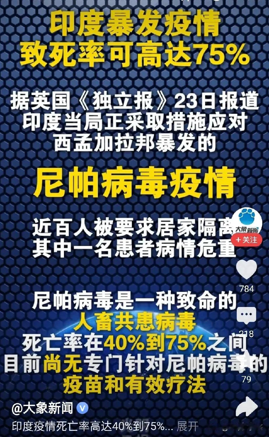 别吓我,不会是第二个新冠病毒🦠吧?这话我昨天刷手机的时候,对着屏幕念叨了好几遍,心里头慌得不行。刚开始刷到印度尼帕病毒的消息,我还以为是网友编的假新闻,毕竟现在网上啥消息都有,博眼球的居多。 可随手往下翻,这消息居然直接冲上了热榜前列,连大象新闻都发了报道,配着官方通报的截图,这下想不信都难了。一看到这病毒,我立马就想起2020年的新冠,那也是在春节前后冒出来的,一下子打乱了所有人的生活节奏。 这次又赶上过年,大家都忙着返乡、走亲戚,人员流动比平时大好几倍,偏偏冒出个印度尼帕病毒,这名字听着就怪怪的,透着一股陌生的恐惧感。更让人揪心的是,消息里说这病毒能人传人,虽然有专家说传播速度没新冠那么猛,但架不住致死率高啊,居然能达到45%-70%,比新冠严重多了。 最关键的是,现在还没有针对这个病毒的特效治疗方法,也没有疫苗可用,这一点和新冠初期简直如出一辙。我特意去翻了翻最新的报道,印度那边已经确诊了5例病例,其中还有医护人员,听说他们是被之前一个有严重呼吸道症状的患者感染的,那人没等做完检测就去世了,现在当地已经有近百人被要求居家隔离。 周边的泰国、尼泊尔都开始紧张了,泰国从26号起就对来自印度疫区的航班全面筛查,落地要测体温、填健康申报表,尼泊尔也在边境和机场加强了检疫。看着周边国家的动作,再想想咱们国内马上要迎来的春运高峰,心里的不安又多了几分。 为了国人的安全,咱们中国真的得提前做好准备,加强防护,尤其是海关防控这块儿,千万不能松懈。过年期间人员流动太频繁,海陆空各个关口都是人来人往,必须采取强硬手段,严格把控每一个入境人员。 不是说要一刀切,但至少要做到精准筛查,所有来自疫区的旅客都得如实申报健康状况,有症状的及时隔离管控,不能让病毒有可乘之机。中国出入境管理部门也得加把劲,守好咱们的国门,这可是第一道防线,容不得半点马虎。 毕竟咱们都经历过新冠的煎熬,知道病毒一旦扩散开来,后果有多严重。说起新冠,真的把人折腾得受不了。 那几年封控、核酸、居家,日子过得提心吊胆,出门都得揣着健康码、口罩。不光是生活不方便,生意也受到了巨大影响,好多小店撑不下去关门了,不少人失业在家,经济也跟着下滑。 这两年好不容易慢慢恢复过来,大家都盼着能安安稳稳过个好年,好好挣点钱,可别再来什么新病毒了,真的折腾不起了。每次听到这类病毒的消息,那些年的焦虑和无助就会涌上心头,真的怕了。 可能有人会说,没必要这么恐慌,专家不是说了吗,尼帕病毒的传播能力没新冠强,咱们国内目前还没有确诊病例。话是这么说,但警惕性绝对不能少,病毒这东西太狡猾了,谁也不知道它会不会变异,会不会突然加快传播速度。 而且这病毒的潜伏期不短,一般4到14天,最长能到45天,初期症状和普通流感差不多,发烧、头痛、呕吐,很容易被忽略,等发现的时候可能已经很严重了。所以不管是为了自己还是家人,大家出门都得带好口罩,尤其是在人员密集的地方,比如车站、机场、商场这些地方,千万不能掉以轻心。 除了戴口罩,平时也要多锻炼身体,跑跑步、散散步都行,增强自身的抵抗力,这才是抵御病毒最根本的办法。另外,要是有近期从印度等疫区回来的朋友,一定要主动向社区报备,一旦出现发烧、头痛这些症状,赶紧去医院,别自己硬扛,也别隐瞒行程。 现在网上关于尼帕病毒的讨论越来越多,有人担心会影响过年出行,有人在分享防护知识,也有人在祈祷病毒别扩散过来。其实大家的心情都一样,都是希望能平平安安、顺顺利利过个好年。 咱们国家经历过新冠疫情的考验,有完善的防控体系和丰富的抗疫经验,只要大家众志成城、团结一致,做好个人防护,配合相关部门的工作,相信一定能守住这道防线。不过话说回来,面对这样的未知病毒,每个人心里都有自己的想法和担忧。 你们觉得咱们目前的防控措施够到位吗?平时出门除了戴口罩,还会做哪些防护呢?欢迎在评论区说说你们的观点。