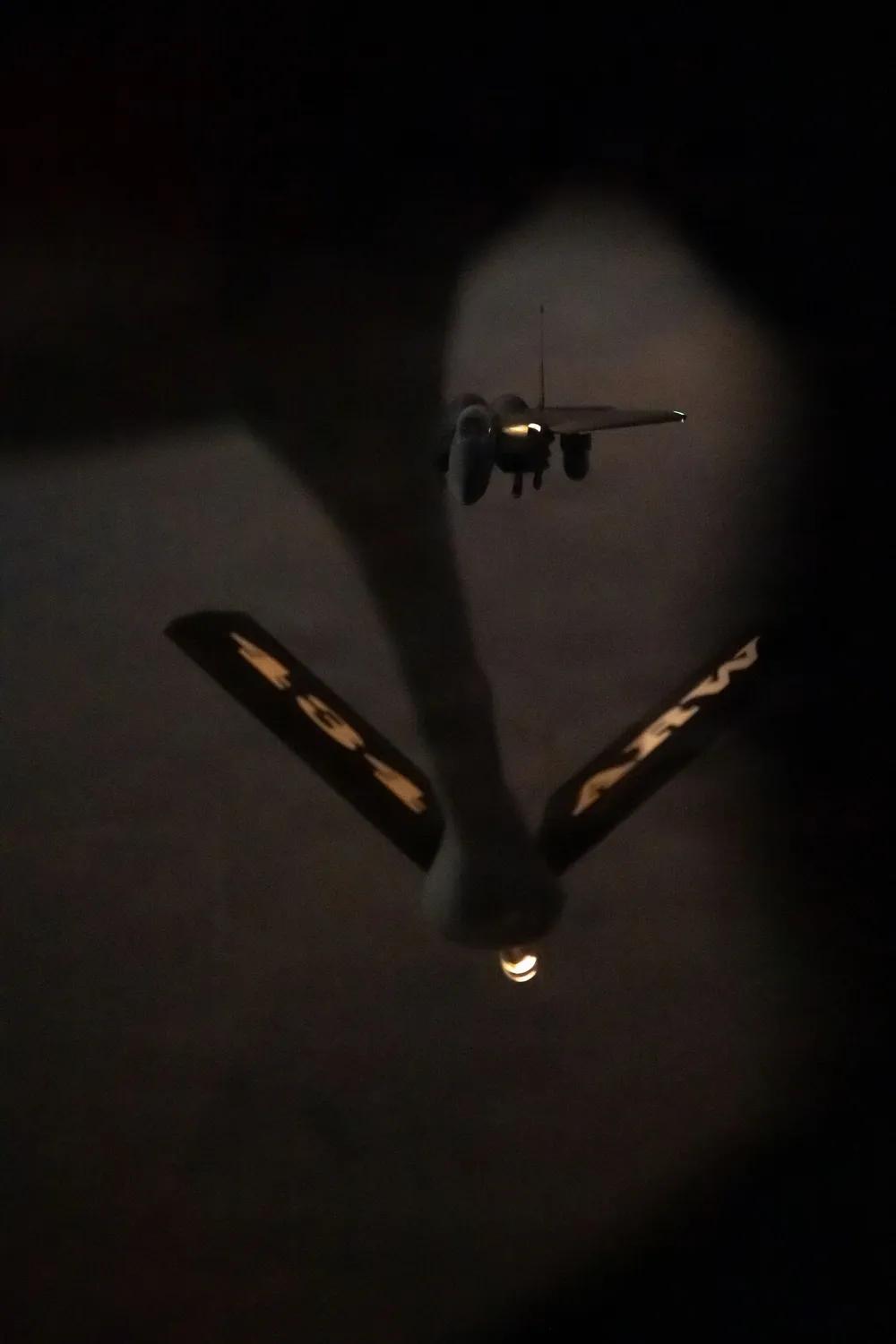 夜间空中加油训练一直是美军重点关注训练项目。 2025年12月4日,一架隶属于美国空军第391远征战斗机中队的美国空军F-15“打击鹰”战斗机正在接受一架KC-135加油机加油,地点为美国中央司令部责任区。KC-135空中加油机在整合空中机动司令部和空中作战司令部能力方面发挥关键作用,确保美国飞机能够在CENTCOM(美国中央司令部)作战区执行空中力量任务。