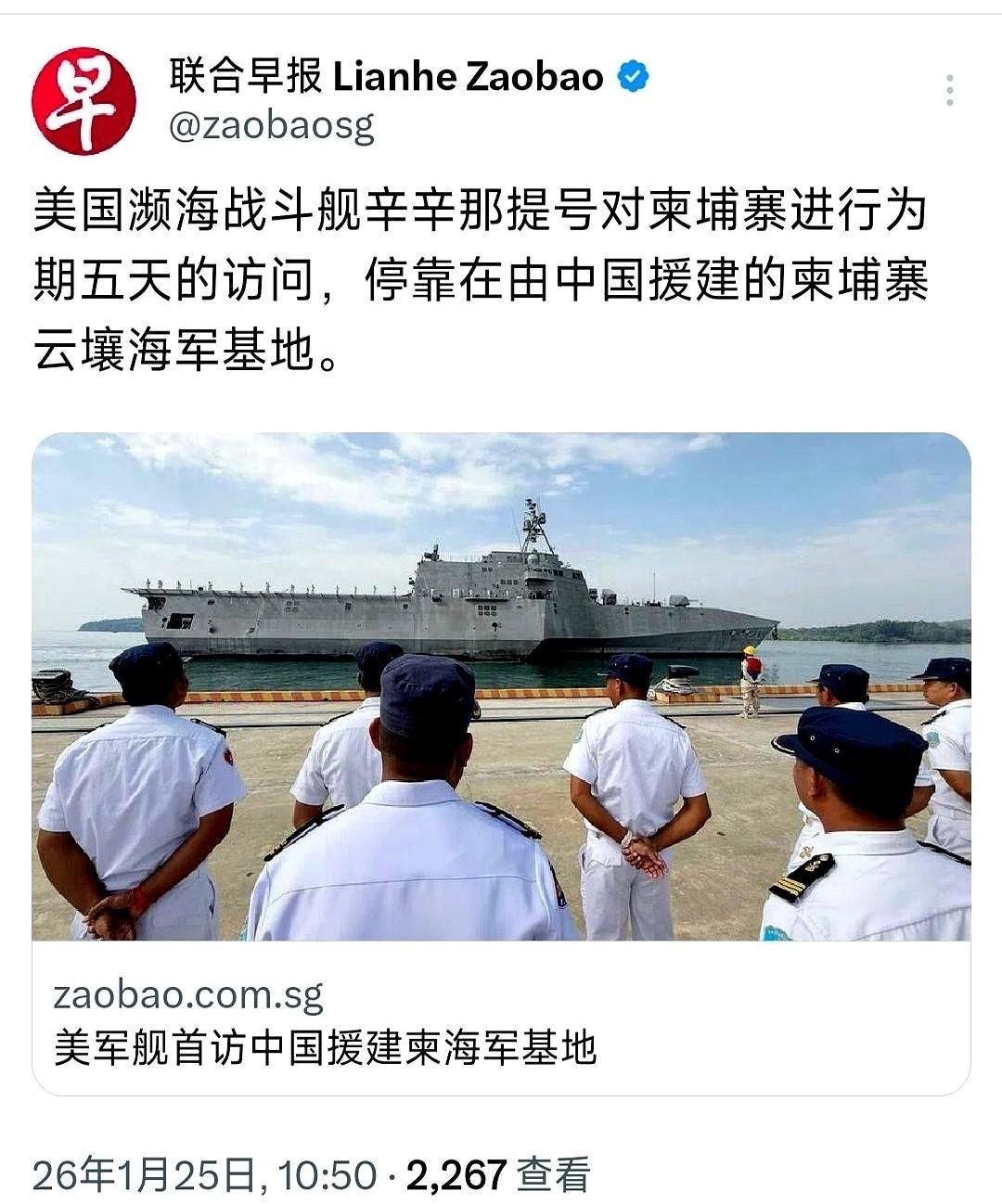 一艘美国军舰,缓缓停进了柬埔寨的云壤海军基地。 离谱的是,这个崭新的码头,每一块砖、每一寸钢筋,都是中国掏钱援建的。 美军“辛辛那提号”战斗舰,就这么大摇大摆地开了进来,进行为期五天的访问。现场,柬埔寨军官们满脸堆笑,和美国大兵握手、合影,气氛热烈得像一场庆功宴。 镜头拉远,崭新光洁的港口设施,在阳光下闪着金属光泽。这些刚刚完工的建筑,还没等来中方的船,先成了美军拍照的背景板。 这操作,简直是当着主人的面,把刚装修好的新房,租给了对家。 这边拿着中国的钱搞基建、谋发展,那边就立刻把大门向美军敞开,换取所谓的“博弈筹码”。 这不叫什么纵横捭阖的“平衡术”。 说白了,就是刚收完朋友送的厚礼,转头就用这份礼,去向朋友的死对头献殷勤。把所有人都当傻子,最后自己就成了那个唯一的棋子。