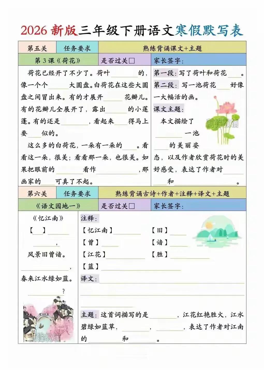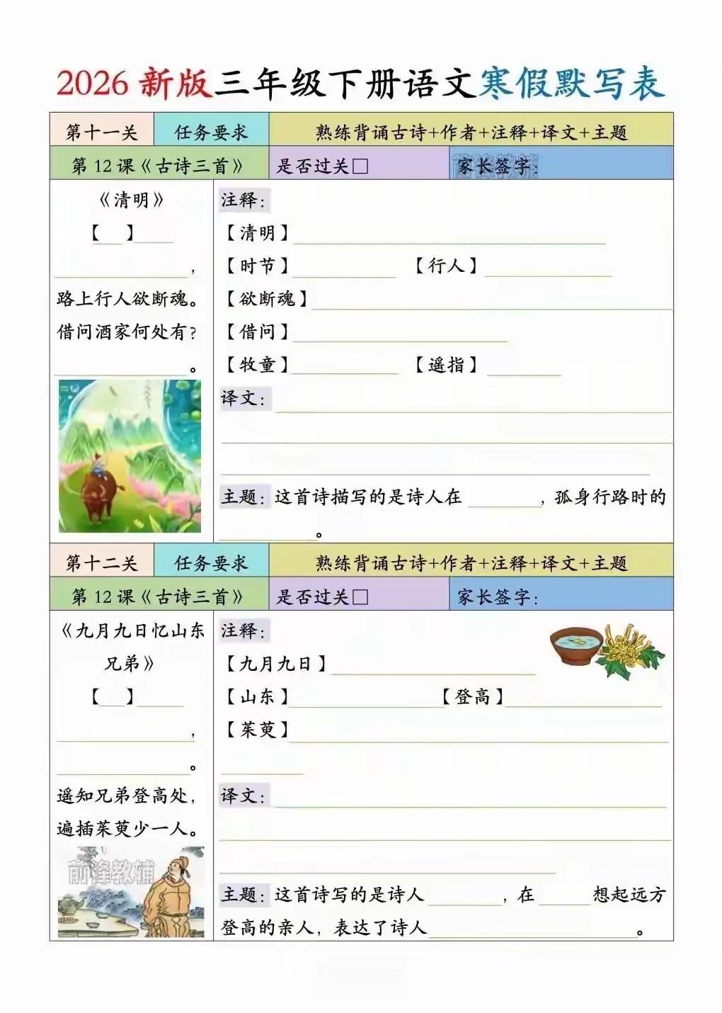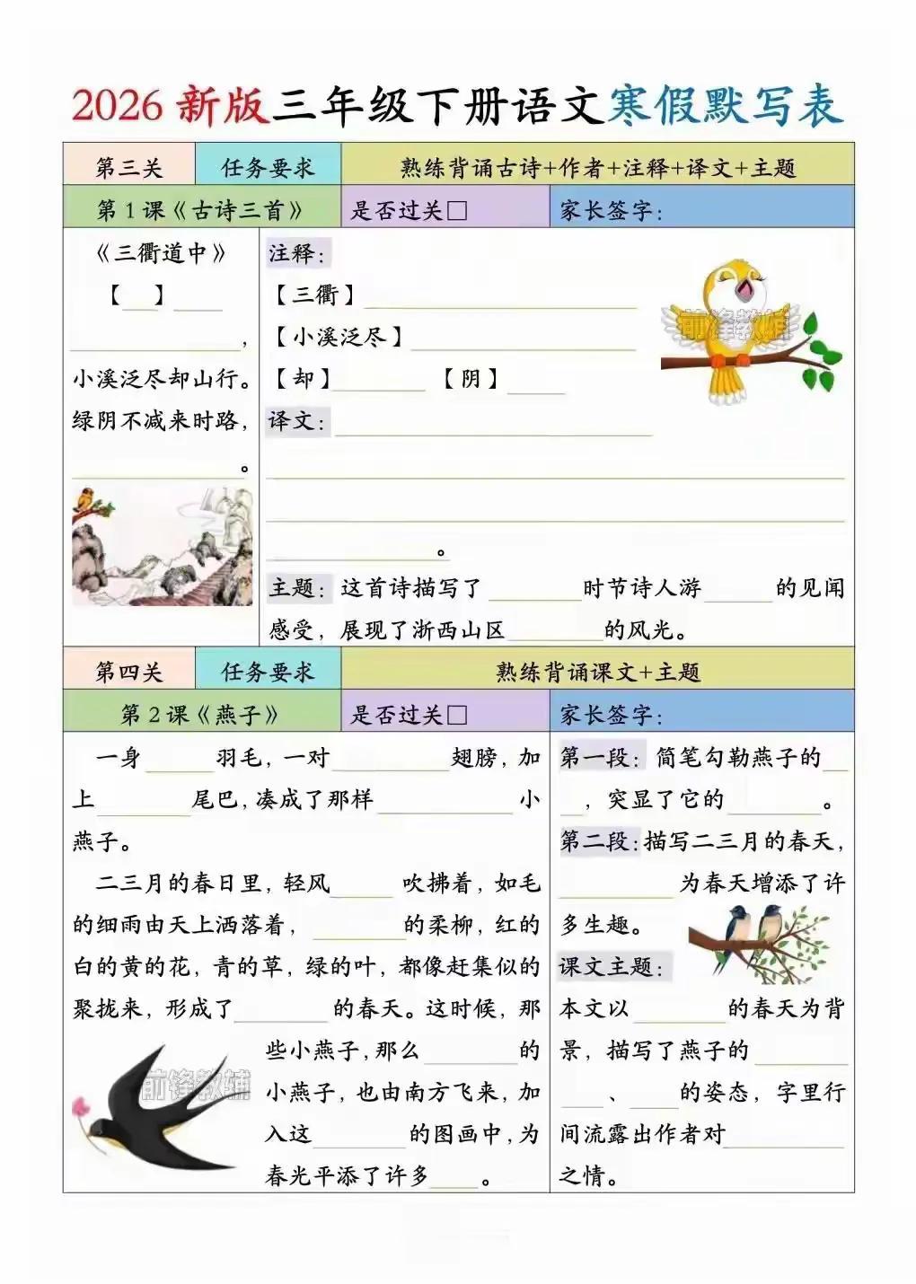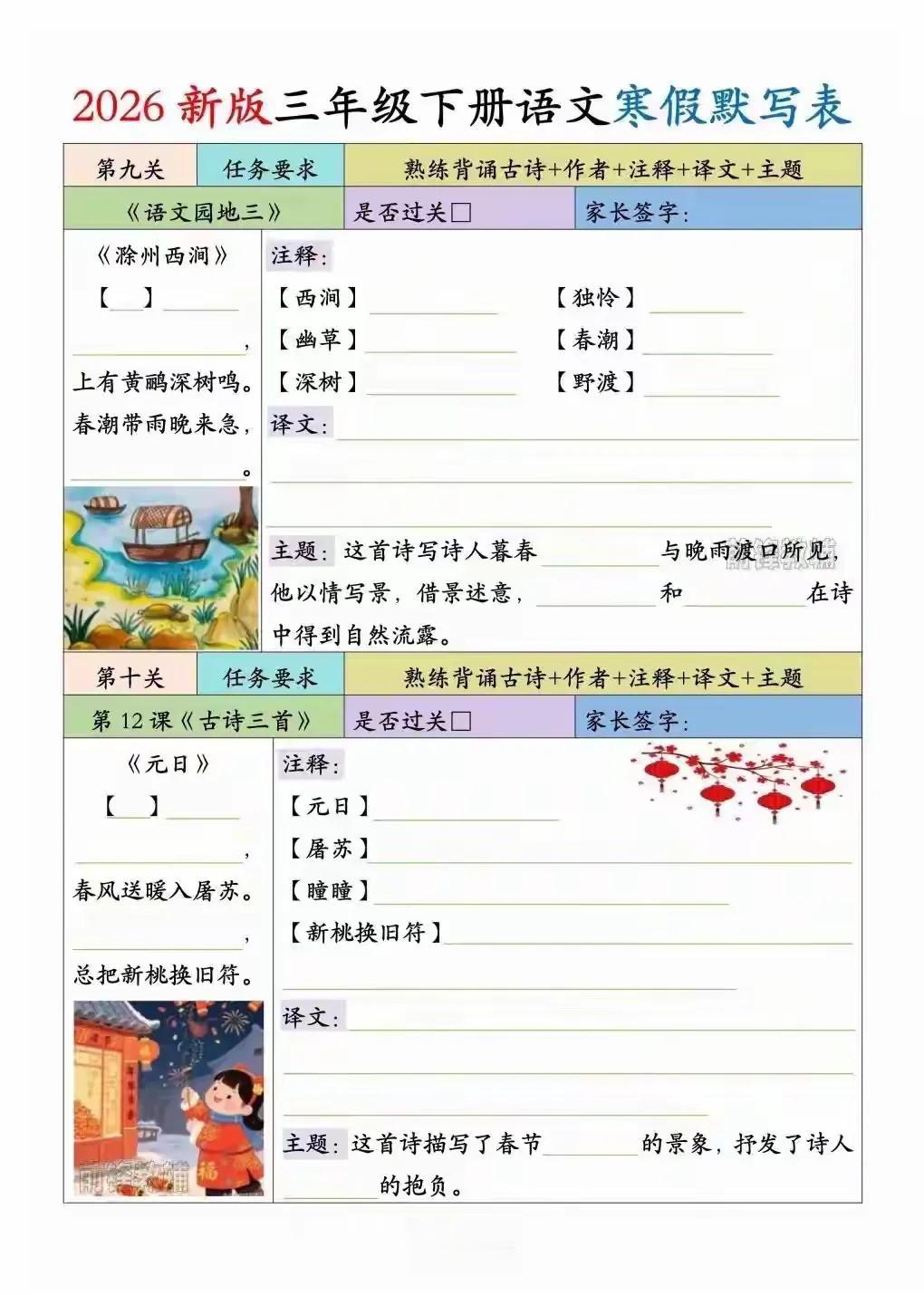 三年级下册语文寒假预习必背诵默写内容古诗词