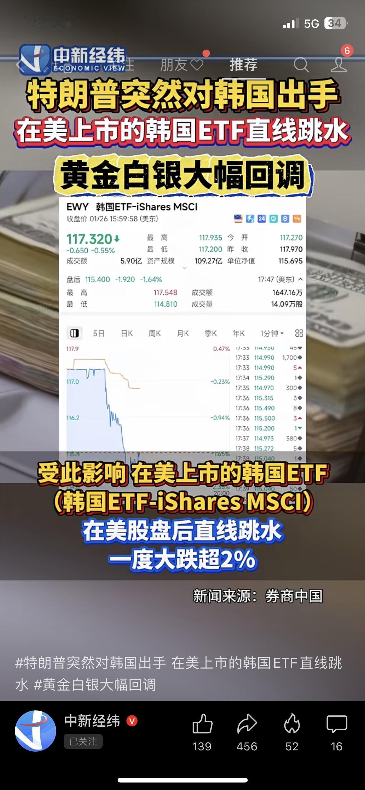 ⚠️特朗普突然对韩出手!韩国ETF直线跳水 特朗普宣布将韩国汽车、制药等产品关税从15%提至25%,在美上市的韩国ETF直接跳水,连带黄金白银也大幅回调! 我做外贸的朋友说,韩系车进口成本又要涨了。 你觉得这会让咱们买进口车更贵吗? 特朗普 韩国ETF 财经热点 市场有风险,投资需谨慎
