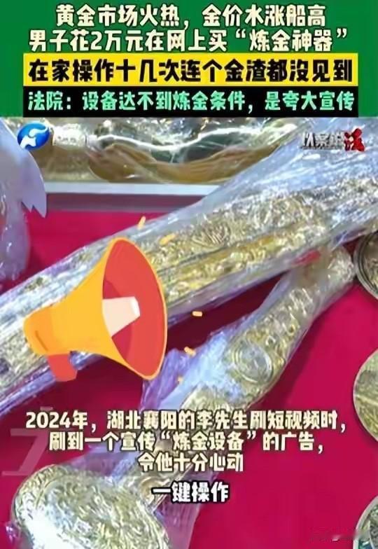 也是吃了没文化的亏!湖北襄阳,一男子看到近期金价上涨也想着赚一笔,偶然在网上看到有人在卖“炼金设备”,介绍月入50000不是梦,男子当即花两万下单,可操作了十几次,别说是金子,连个金渣都没看到 李先生介绍,前不久在网上看到一条广告,说得那叫一个诱人:买套设备,用些废旧材料,不用啥技术,按个键就能在家炼金子,轻松月入五万 李先生心动了。他没细琢磨这里头的门道,只觉得是个难得的“机会”,很快联系上商家,花两万块钱把这套号称能“点石成金”的设备搬回了家 设备到了,配套的教程、推荐的“原料”也都齐了。李先生满怀希望,照着说明一遍遍操作,折腾了十几次。结果呢?别说金疙瘩、金条了,就连一丁点像金子的渣子都没见着。两万块钱买的,仿佛是个玩笑 他这才醒过神,知道自己可能上当了,赶紧找商家理论,要求退货退款。对方自然不答应,买之前说得天花乱坠,出问题了就各种推脱。李先生没办法,一纸诉状把商家告上了法庭 法院审理下来,情况很清晰。那套设备根本达不到真正炼金的技术条件,商家的宣传明显是夸大、误导。经过法院多次在中间调解,双方最后达成了协议:商家把两万块钱全数退给李先生,李先生则把设备寄回去。这事才算有了个了结 这事儿想想,挺有代表性的 李先生吃了亏,表面看是轻信了广告,但往深里想,其实是吃了对行业规律和基本常识不了解的亏。炼金要真这么简单,买个设备在家就能月入数万,那金子还能这么值钱吗?任何看起来“一本万利”、“无门槛暴富”的门路,背后九成九都是坑 说到底,财富的积累,很少真有“捷径”。它往往需要扎实的知识、辛勤的付出,或者经年累月的积累。看到特别“美好”的机会时,不妨先冷静下来,多问几个为什么,查查背景,想想逻辑。有时候,克制住那一瞬间的冲动,就能避开一个大坑。踏实挣钱,心里才最安稳。