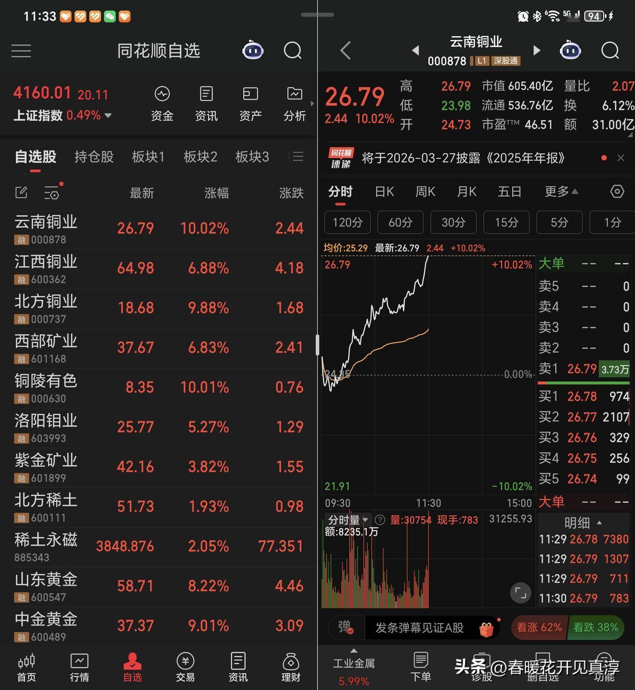 中午收盘,我们看到有色大面积涨停,金银铜铝锡锌好像都在涨,云南铜业迎来久违的涨停,中国铝业也涨停了。反观指数是平稳的,说明有些板块是下跌的。 在这个时候,券商板块基本上保持了平稳。今天,券商有一个异常的情况是,国投资本突然开始领涨,虽然涨幅不大。 今天多发了几篇,不多说了,有兴趣的朋友可以翻翻前面的两个帖子。 多说一句,大家也可以看到北方稀土,在这一波上涨里面,北方稀土不属于同频的品种。