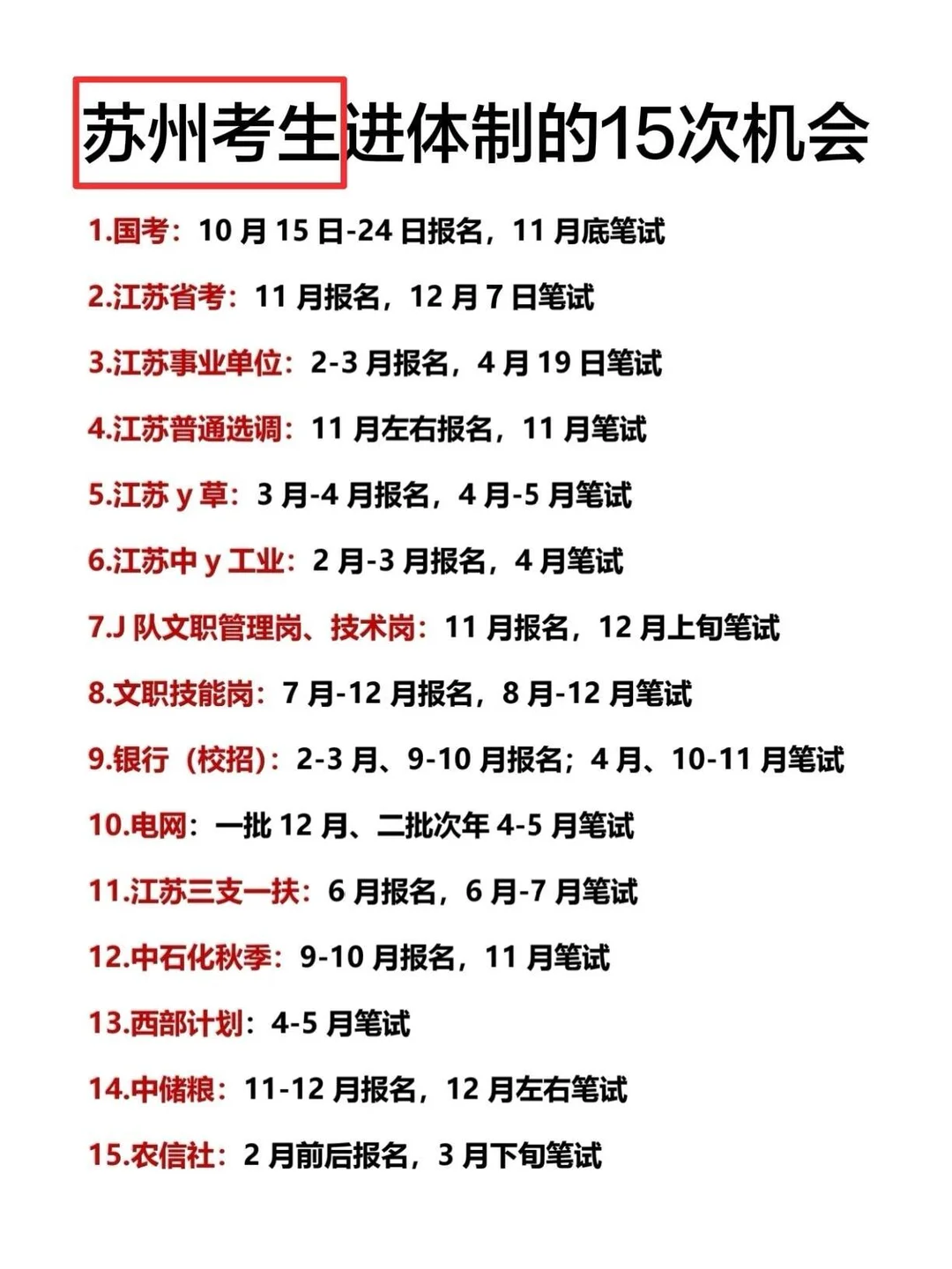 😎苏州的同学大胆去考公考编!😎 🎉接下来还有这么多进体制的机会,赶紧提前准备起来吧!毕业瞬间不愁了! ✅苏州考公难度梯队(参考) 第一梯队(★★★★★):苏州工业园区、昆山、姑苏区 第二梯队(★★★★):高新区、吴中区、相城区 第三梯队(★★★):吴江、张家港 第四梯队(★★):常熟、太仓 ✅苏州gwy待遇梯队(参考) 第一梯队(25-30w):苏州工业园区、昆山 第二梯队(23-25w):高新区、吴中区、相城区 第三梯队(20-23w):吴江、张家港 第四梯队(16-20w):姑苏区、常熟、太仓 江苏事业编江苏省考苏州事业编苏州公务员苏州事业编岗位表江苏事业编岗位表江苏公务员