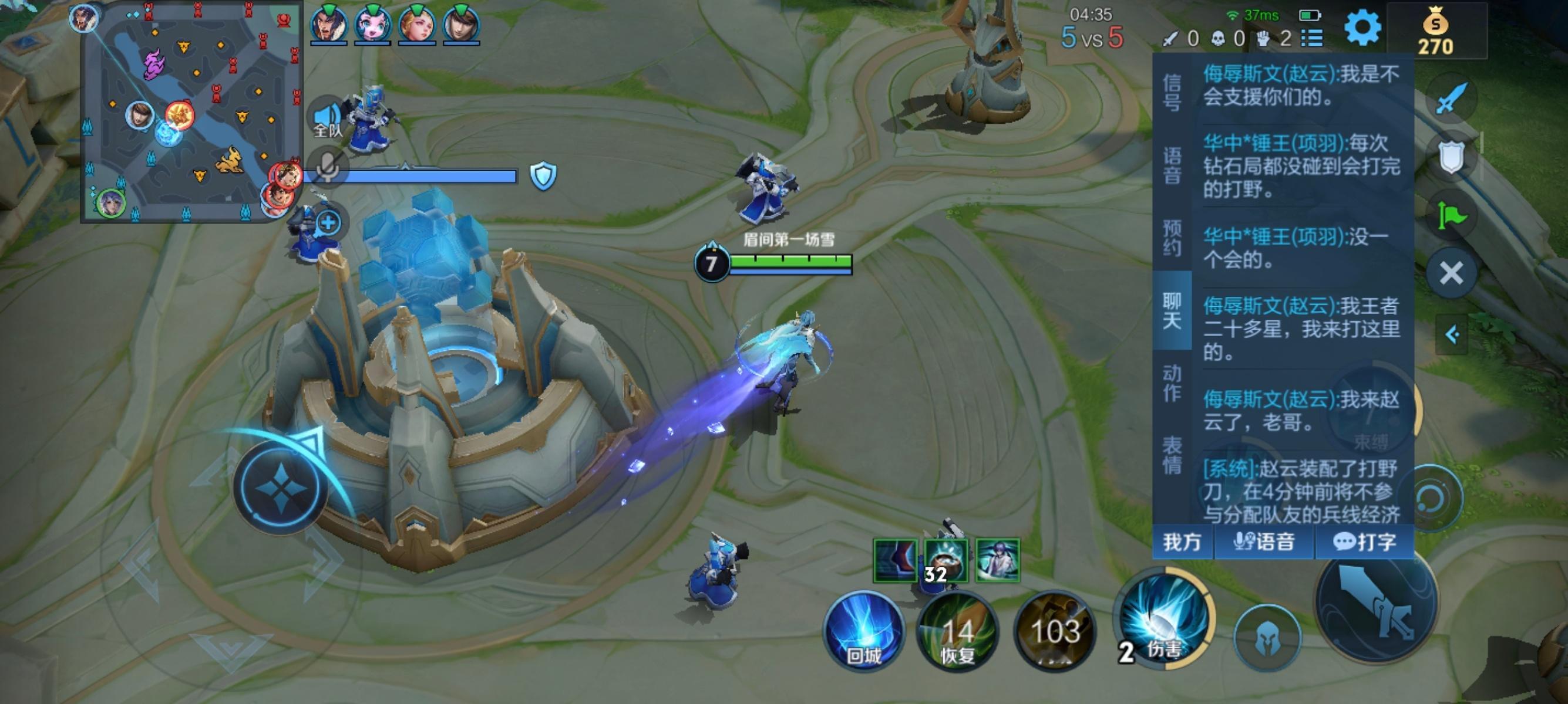 被对面反野我去帮赵云守了一下,对面三个人来,没打不过,赵云没了,然后赵云说他不会支援我们的 。项羽说暂时都没遇到过会玩的打野,赵云就说他是来炸鱼的,他大号20多星我肚肚笑炸了