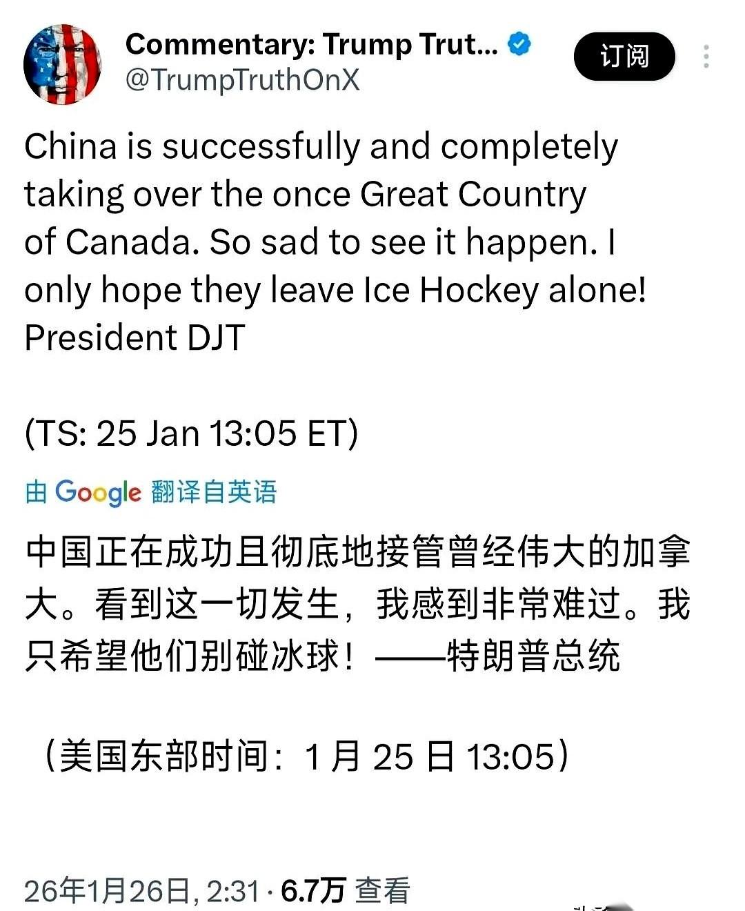 特朗普的社交账号,又跳出一条新动态。 点开,第一行字就直接把加拿大和中国绑在了一起,说我们正在“成功且彻底地接管”那个曾经伟大的国家。字里行间,满满都是“看着这一切发生我很难过”的调调。 没有提经济,没有提协议。 就这么一句,像一枚图钉,直接钉在了地图上。 但屏幕往下一滚,画风突然就拧巴了。在这么大的“帽子”底下,他敲出了整篇最让人摸不着头脑的一句话,像是在自言自语,又像是在对谁下最后通牒—— “我只希望他们别碰冰球!” 对,冰球。 一个前总统,在讨论两个大国的“接管”问题时,最后落脚点,不是别的,是这项运动。 这到底是把国家大事当儿戏,还是用一个看似儿戏的比喻,在说一句最狠的话?