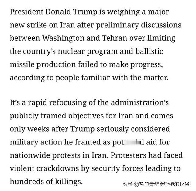 据美国有线电视新闻网(CNN)周三援引消息人士报道,美国总统唐纳德·特朗普正在考虑对伊朗发动一次新的重大打击,打击目标可能包括伊朗领导人和安全官员,以及伊朗核设施和政府机构。