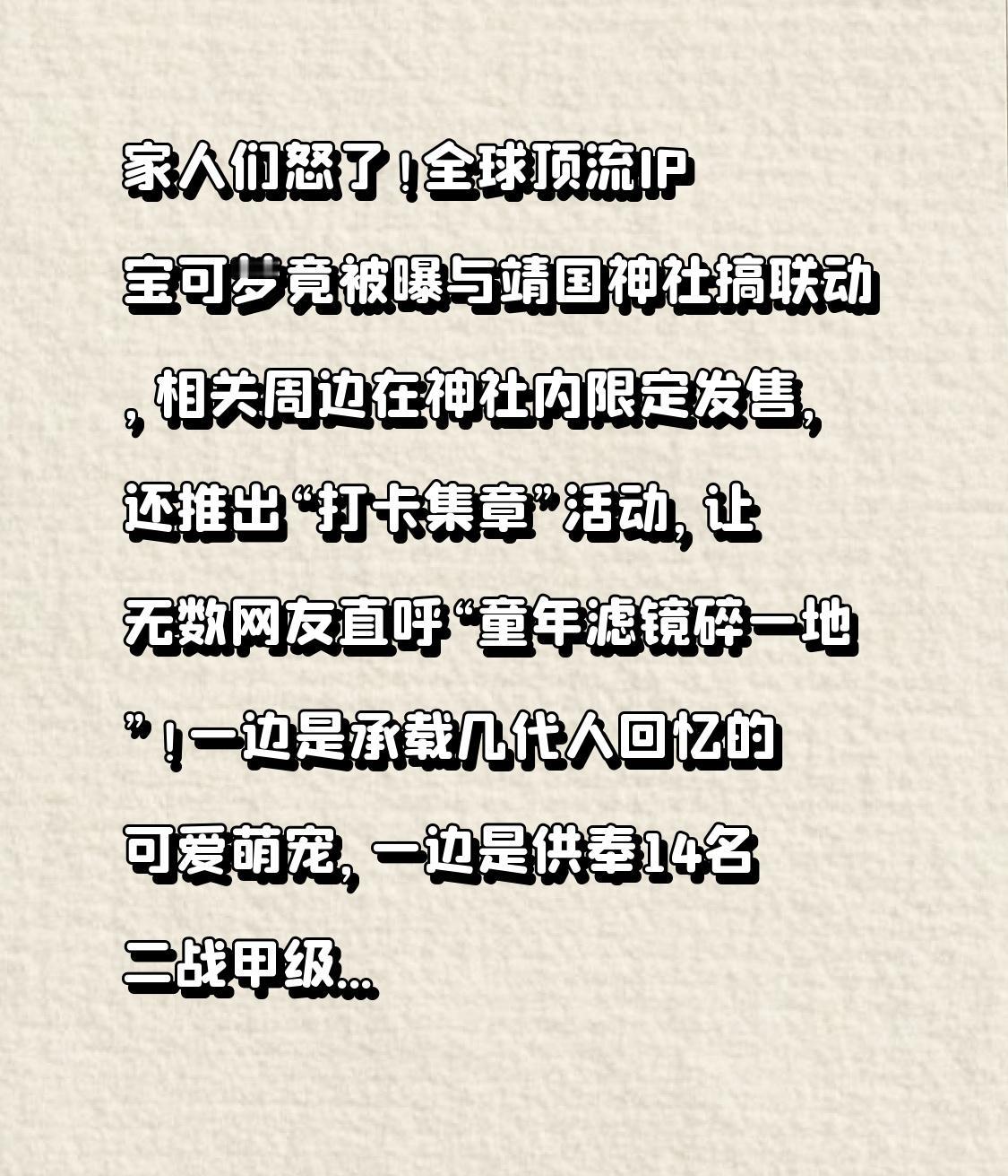 家人们怒了!全球顶流IP宝可梦竟被曝与靖国神社搞联动,相关周边在神社内限定发售,还推出“打卡集章”活动,让无数网友直呼“童年滤镜碎一地”!一边是承载几代人回忆的可爱萌宠,一边是供奉14名二战甲级战犯、象征日本军国主义的罪恶之地,这种跨界联动到底是无心之失,还是刻意洗白历史? 先看这场争议的来龙去脉:有网友在东京旅游时发现,靖国神社内的纪念品商店开始售卖宝可梦联名钥匙扣、明信片,上面印着皮卡丘、杰尼龟等经典角色,还标注“靖国神社限定”字样。更离谱的是,神社推出“祈福集章活动”,游客集齐5个印章就能兑换宝可梦主题祈福牌,而集章点就分布在供奉战犯的灵玺簿奉安殿附近。 消息传到国内,瞬间引爆全网愤怒!网友们纷纷吐槽:“皮卡丘那么可爱,怎么能和战犯神社绑在一起?”“我的童年IP被玷污了,这是在给军国主义站台!”要知道,靖国神社从来不是单纯的宗教场所,而是日本军国主义的精神工具——里面供奉着东条英机等14名甲级战犯,他们双手沾满中国和亚洲各国人民的鲜血,神社内的游就馆更是公然美化侵略战争,把南京大屠杀歪曲成“消灭伪装平民的军人”。 但关键转折点来了:这绝非简单的商业联动,而是用娱乐消解历史的阴险操作!宝可梦作为全球知名IP,受众大多是青少年,对历史认知尚不深刻。把可爱的动漫角色与靖国神社绑定,本质上是想通过“软文化”包装,淡化神社的军国主义色彩,让年轻人在打卡、购买周边的过程中,逐渐接受这个充满罪恶的场所,甚至扭曲对历史的认知。 更让人警惕的是,这种“历史洗白”早有先例:之前曾有台媒炒作“台湾樱花植入靖国神社”,还立碑纪念所谓“台籍日本兵”,被网友痛骂“跪舔战犯”;靖国神社本身更是常年否认战犯存在,声称“所有死难者都是为国献身”。现在借助宝可梦的影响力,更是把这种历史虚无主义推向了年轻群体,用心极其险恶。 值得欣慰的是,无论是中国网友还是全球爱好和平的人士,都坚决抵制这种行为!国内网友发起抵制联名活动,呼吁任天堂停止合作;不少日本网友也发声反对:“宝可梦是给孩子的礼物,不该和政治、战争挂钩”。外交部早已明确表态,靖国神社问题是对历史正义的亵渎,伤害亚洲受害国人民感情,任何企图美化侵略历史的行为,都必然遭到强烈反对。 其实我们愤怒的,从来不是宝可梦本身,而是这种“娱乐至死”的历史漠视。童年IP再美好,也不能成为洗白罪恶的工具;商业联动再吸金,也不能触碰历史底线。忘记历史就意味着背叛,那些在战争中牺牲的同胞、那些被侵略的苦难岁月,永远不能被轻飘飘的动漫角色所掩盖。 作为普通人,我们能做的就是坚决抵制这种不当联动,告诉身边人靖国神社的真实面目,不让历史虚无主义有可乘之机。真正的文化交流,是建立在正视历史、尊重伤痛的基础上,而不是用娱乐包装罪恶,践踏人类良知。 你支持抵制宝可梦与靖国神社的联动吗?遇到这种触碰历史底线的商业操作,你会怎么做?评论区聊聊你的看法,也别忘了点赞转发,让更多人警惕历史洗白的阴险套路,守护我们的历史记忆!