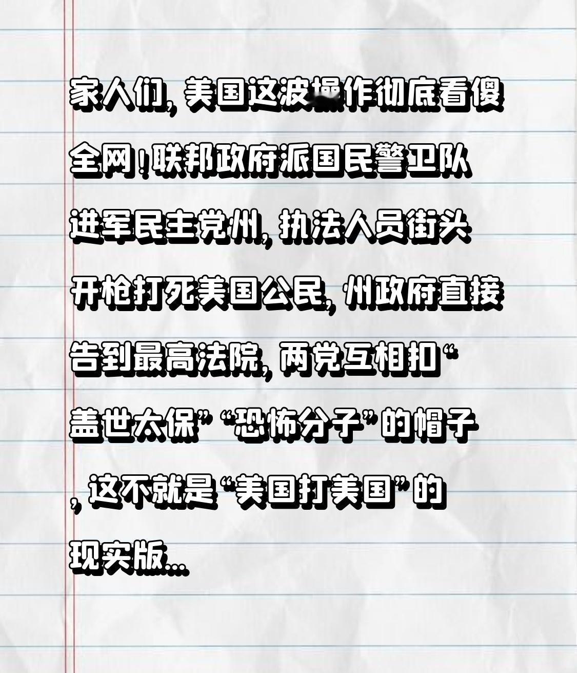家人们,美国这波操作彻底看傻全网!联邦政府派国民警卫队进军民主党州,执法人员街头开枪打死美国公民,州政府直接告到最高法院,两党互相扣“盖世太保”“恐怖分子”的帽子,这不就是“美国打美国”的现实版?短短一个月,两场致命枪击、一次军事对峙,曾经的超级大国,怎么就陷入内斗泥潭了? 先看最让人揪心的街头惨案:明尼阿波利斯市,联邦移民执法局(ICE)一个月内接连开枪打死两名美国公民。37岁的护士普雷蒂,只是想保护被执法人员推倒的女子,全程举着手机拍摄、双手过顶,结果被执法人员连开10枪打死。可联邦政府却宣称他“持枪暴力反抗、企图屠杀执法人员”,但现场所有视频里,根本没看到他拿枪,家人痛斥这是“预谋杀人”。更讽刺的是,另一名死者古德,被执法人员形容为“暴力骚乱者”,尸检却显示她身中3枪,其中头部是致命贯穿伤,而她只是想驾车离开执法现场。 而这还只是冰山一角,更大的冲突在政府层面爆发!特朗普政府为了打击非法移民,要向芝加哥部署500名国民警卫队,结果伊利诺伊州州长直接硬刚,说这是“侵略行为”,反手把联邦政府告上法庭。联邦法官紧急下发临时限制令,阻止军队部署,可白宫放话要援引《反叛乱法》强行派兵,连前共和党州长都警告:这会引发宪政危机,可能让美国陷入内战边缘。一边是联邦执法人员在居民区用催泪弹、直升机突袭,把小学变成“封锁区”;一边是州政府拒绝合作,民主党议员喊着要切断联邦机构的拨款,双方剑拔弩张,完全没了国家共识。 关键转折点来了:这根本不是简单的执法争议,而是两党博弈下的社会撕裂!民主党骂ICE是“盖世太保”,共和党反击州政府“妨碍执法”,特朗普把死者称为“本土恐怖分子”,奥巴马、克林顿直接下场谴责联邦政府“撒谎”“恐吓民众”。表面上是移民政策之争,实际上是权力的互相碾压——联邦政府想靠强硬执法刷支持率,州政府为了选票抵制联邦指令,最后受伤的却是普通民众。明尼阿波利斯市民冒着零下30度的严寒抗议,喊出“这是街头屠杀”,可他们的诉求,在两党的骂战中根本没人真正倾听。 更可怕的是,这种内斗已经让美国社会彻底对立。2025年美国发生407起大规模枪击,1.46万人死于枪暴力,执法人员滥用武力的事件越来越多,却几乎不用承担责任。联邦与州对着干,党派之间互相拆台,执法机构与民众站在对立面,曾经引以为傲的“民主制度”,现在成了内耗的工具。就像芝加哥街头的抗议者举的牌子写的:“我们不是敌人,分裂才是”。 其实一个国家的强大,从来不是靠军事威慑和政治博弈,而是让民众能安心生活、不受暴力威胁。当执法人员可以随意开枪,当政府之间为了权力互相攻击,当普通公民的生命权被当成博弈筹码,这样的“分裂”比任何外部威胁都更致命。 你觉得美国的内斗会越来越严重吗?这样的分裂背后,到底是谁在获利?评论区聊聊你的看法,也别忘了点赞转发,让更多人看到超级大国光鲜背后的真实困境!最后希望每个国家都能以民为本,少点内耗,多点安宁。