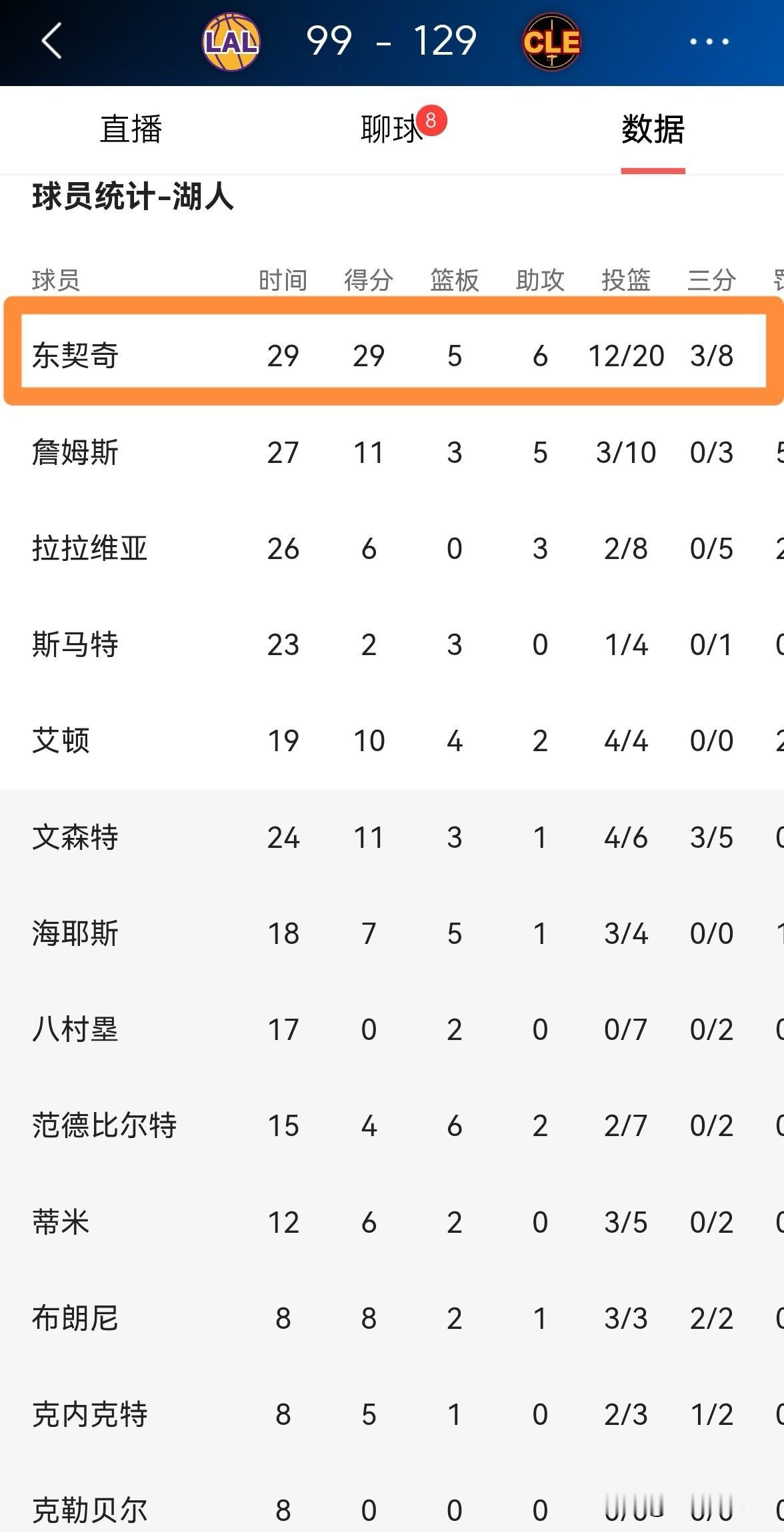 湖人当家球星东契奇真是欲哭无泪!在今天湖人客场以99:129惨败于骑士的比赛中,东契奇依旧打出了超级巨星的表现,可惜的是他身边的队友全是一群铁匠,因此他的出色表现化为了泡影。 全场比赛下来,东契奇首发出战29分钟,投篮20中12,其中三分球8中3、罚球6中2砍下29分5篮板6助攻。