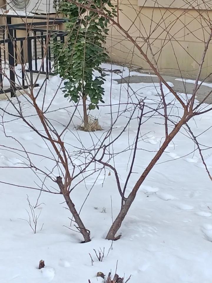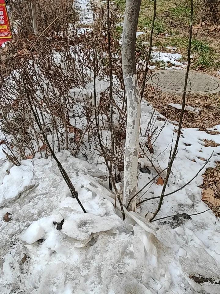 烟台的雪还没有化,树根底下被白雪覆盖着,落叶的乔木全部落光了叶子,只有冬青树写出