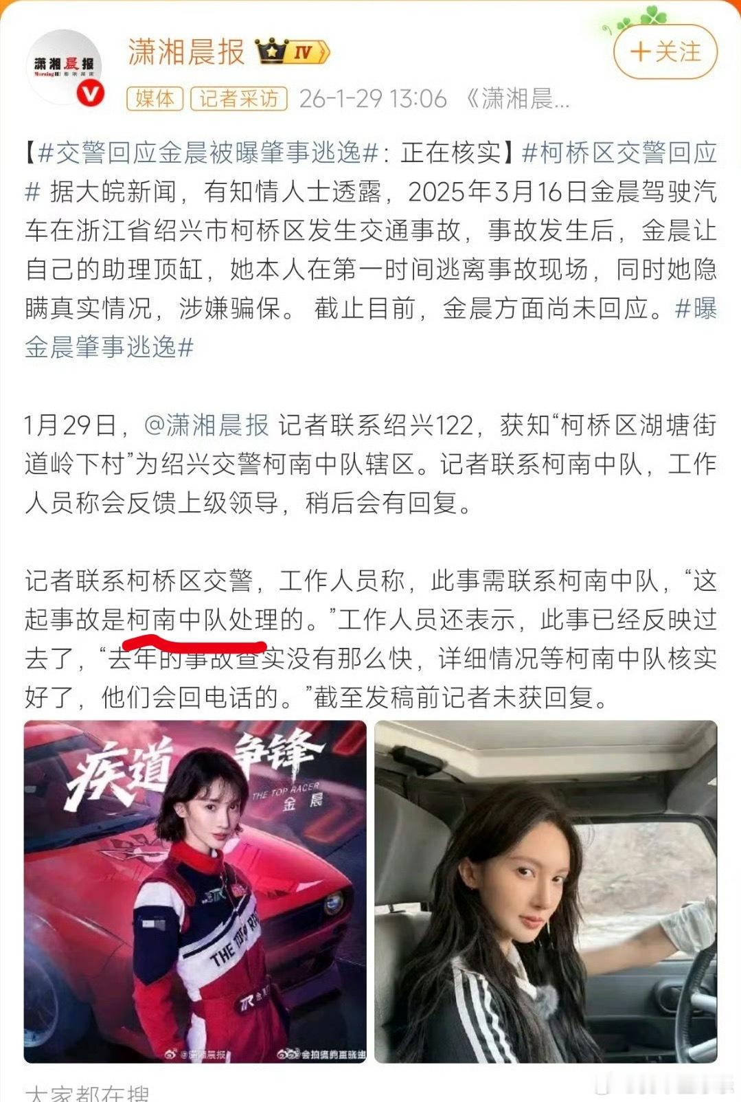 交警回应金晨被曝肇事逃逸完了,肯定查清楚了。里面写的,“柯南中队”查的,肯定蛛丝马迹都逃不过,发言人是谁我都能猜到。曝金晨肇事逃逸